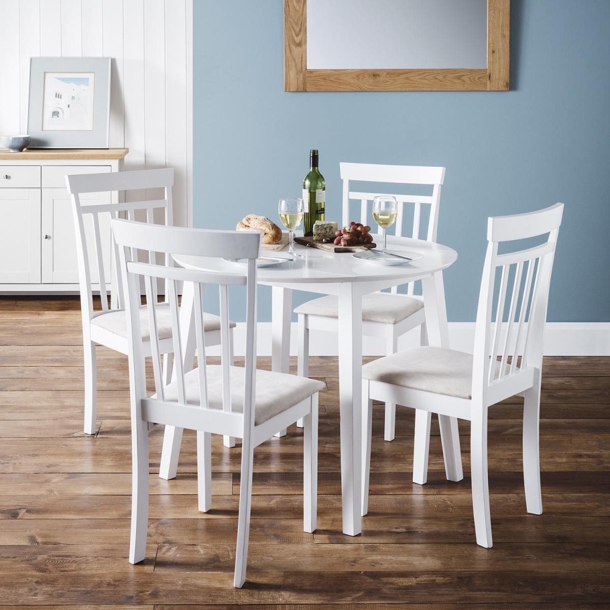 I love the drop-leaf table’s clever design - it tucks neatly away when you’re short on space but extends to seat four with ease. The crisp white finish and tapered legs work well in Scandi, coastal or modern farmhouse schemes. Pair it with mixed-style chairs and natural linen placemats for a relaxed, layered look. As a handy styling tip, keep a simple ceramic bowl or low vase at the centre and switch up textiles seasonally - think woven runners in summer and cosy wool napkins in winter.