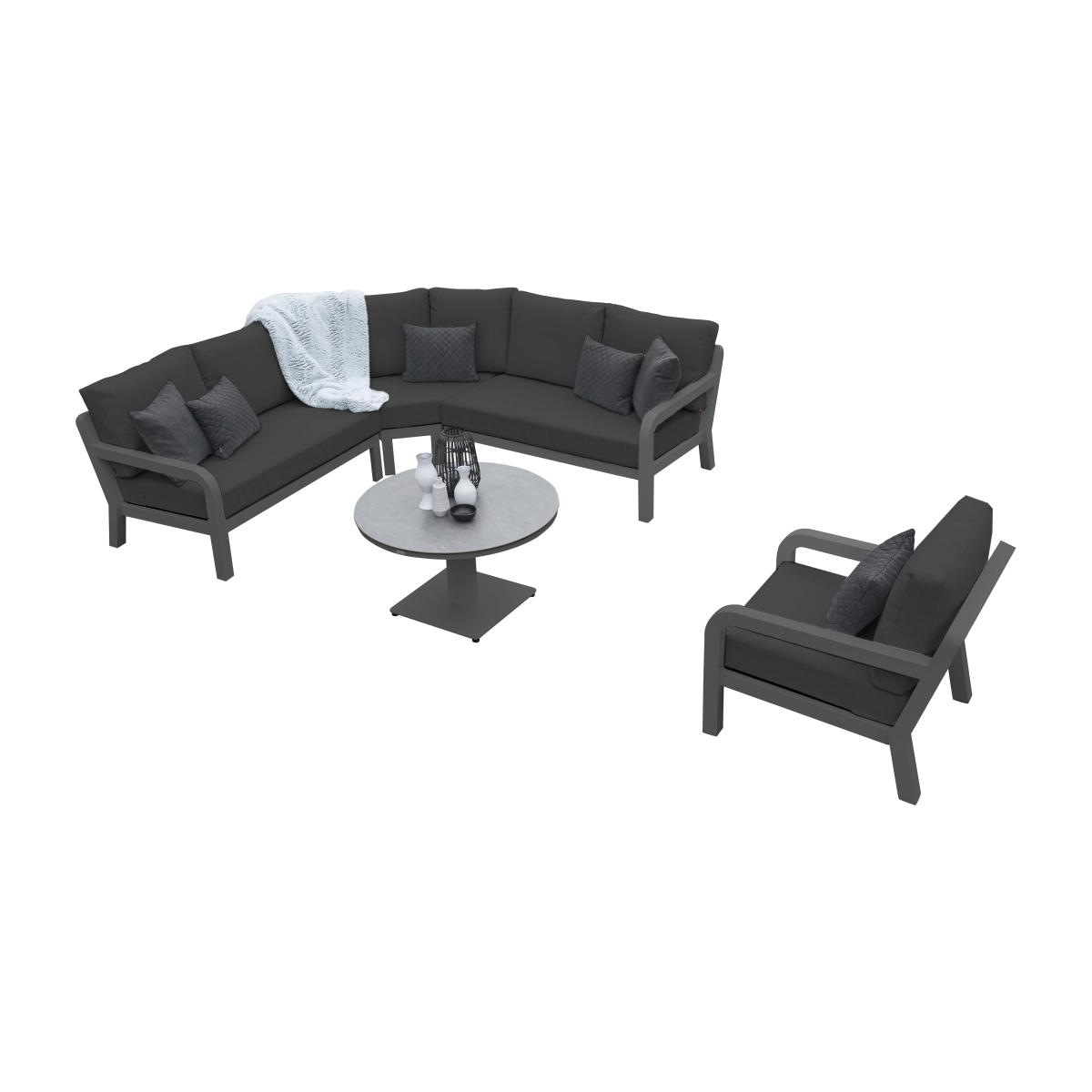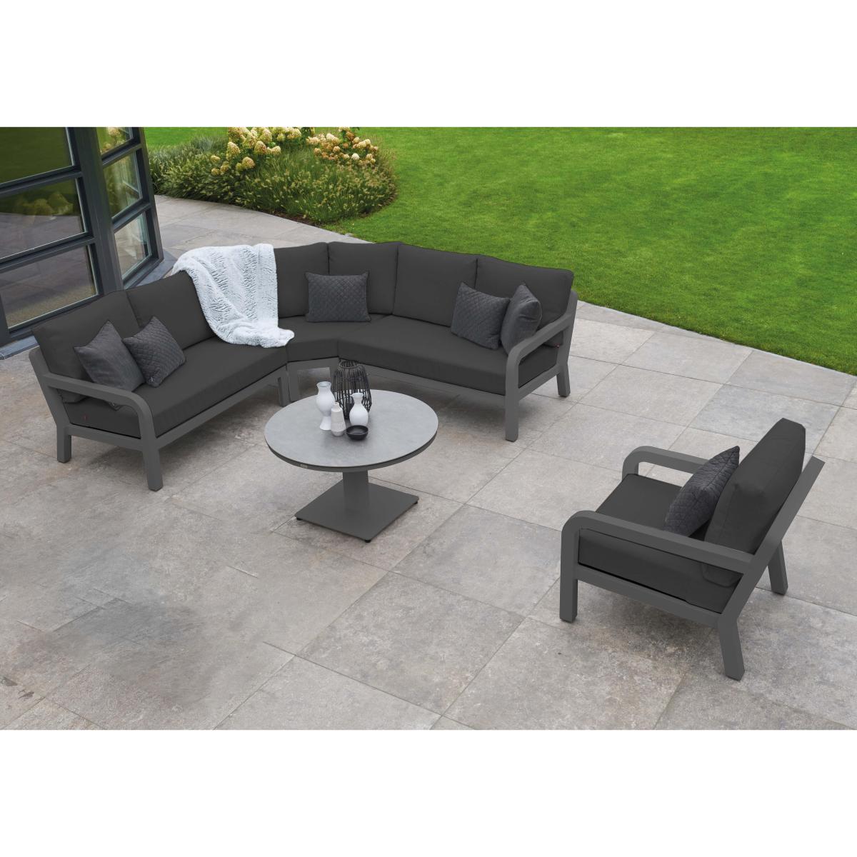 Comfort meets contemporary style in this garden furniture set for larger outdoor spaces. The combination of low corner sofa and armchair makes it easy to seat everyone, and we love the height-adjustable coffee table. Why you'll love it. Entertain in sociable style with this on-trend outdoor furniture set. Modern design, contemporary comfort. Large-scale set includes a corner sofa, armchair and coffee table. Sofa and chair have chunky dark grey aluminium frames. Seat cushions are reversible. Dark grey Soltex cushion upholstery is weatherproof. Micro-porous cushion fillings allow water to drain away which means no mildew build up. Aluminium circular coffee table set on a square base. Height-adjustable with a gas-lift mechanism. Durable tempered glass and spray stone top. What you need to know. Frames are made of aluminium. Chair frames and tables can be left outside year round. We recommend the cushions are stored in a dry area during wet weather and when not in use. Aluminium frames should be cleaned with warm soapy water and a soft cloth. Avoid abrasive cloths or chemical cleaners. If your aluminium furniture is exposed to coastal winds, wipe it regularly and cover in winter and in stormy weather. Corner sofa is supplied in 3 sections. Self assembly required.