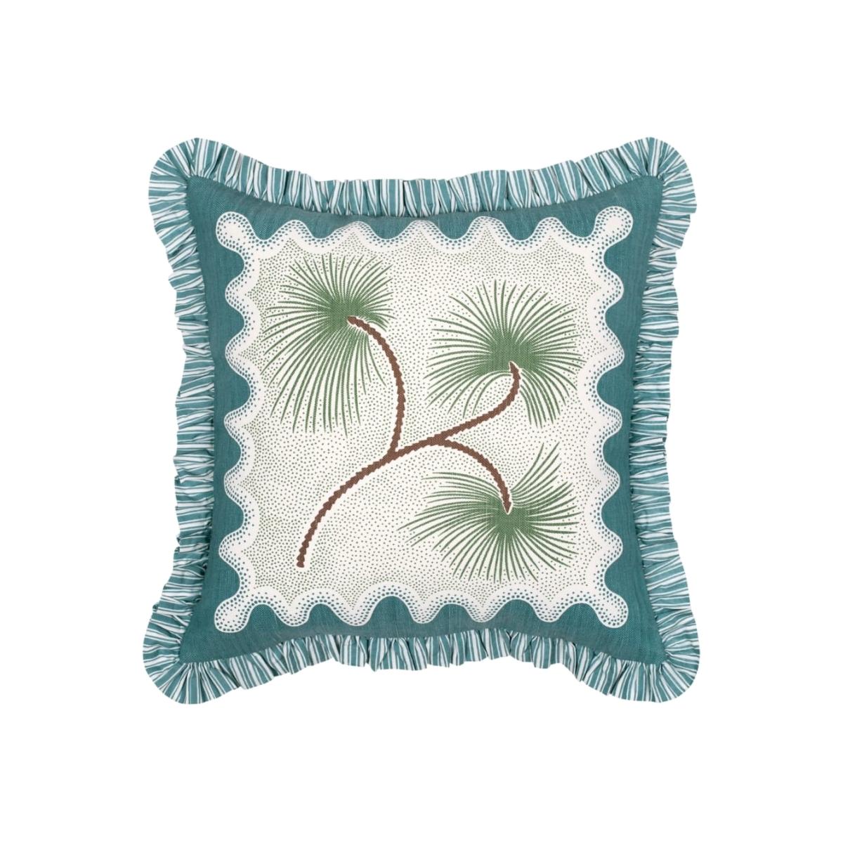 This charming cushion features delicate palm frond prints in soft sage green, framed by a playful teal ruffle border. The whimsical combination of tropical motifs and gathered trim creates a perfect accent piece for adding a touch of seaside elegance to sofas, chairs, or bedroom decor.