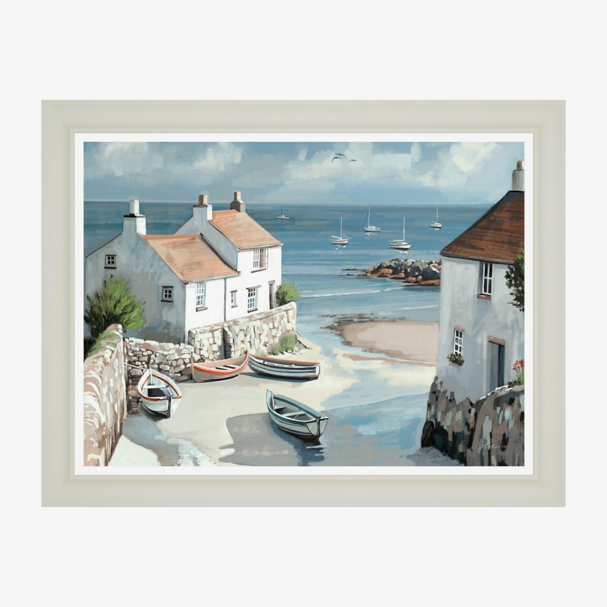 Step into a peaceful seaside village with the Coastal Cove Framed Art. This calming piece shows a charming cove with white cottages, colourful boats and a sparkling blue sea that perfectly captures an idyllic summer's day.