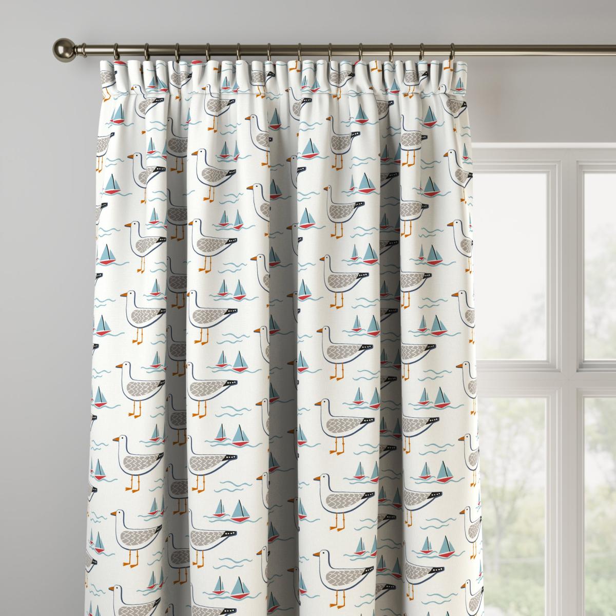 Featuring a playful, quirky, animated design, the 100% cotton Coastal Gull fabric evokes a nautical feel with a typical coastal resort scene and showcases a fun seagull and sailboat pattern sitting on a rich navy or unintrusive pale background. This design is full of life yet put together in a cool and calming manner, sure to bring joy into any room. Our Web Exclusive Coastal range features 9 beautiful, unique designs for curtains, upon a 100% cotton fabric base, and includes a wide range of styles. Introducing bright and breezy seaside designs into your décor, like Lundy, Gulls, Ocean Yatch, Clovley, Salcombe Stipe and Seaton Stripe, will create a stunning, colourful focal point in any room. 100% natural fibres like cotton are kinder to the environment, as well as to our skin, being naturally hypoallergenic, meaning they are ideal for sensitive and allergy-prone skin, as well as having unique anti-bacterial qualities. You can feel confident that our Coastal range will be gentle to the environment, and to those who may sit close. For windows that cannot wait, shop our range of. Ready Made Curtains. Please note: you measure for pinch pleat curtains in the same way as pencil pleat curtains. Online Only:. This product is only available to order online. Our expert virtual consultants can provide advice on measuring/fitting and style tips and our free samples can be ordered online to be delivered straight to your home to help you choose a fabric that's right for you. Once you're happy, simply place your order online and we'll do the rest.