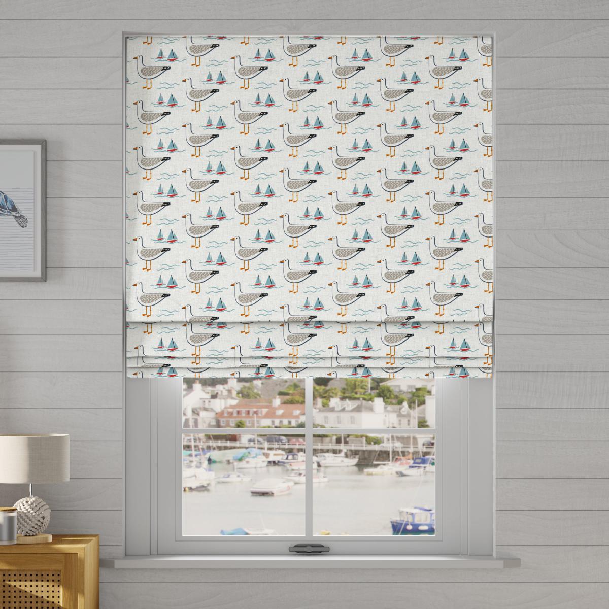Featuring a playful, quirky, animated design, the Coastal Gull fabric evokes a nautical feel with a typical coastal resort scene and showcases a fun seagull and sailboat pattern sitting on a rich navy or unintrusive pale background. This design is full of life yet put together in a cool and calming manner, sure to bring joy into any room. Our Web Exclusive Coastal range features 9 beautiful, unique designs for curtains, upon a 100% cotton fabric base, and includes a wide range of styles. Introducing bright and breezy seaside designs into your décor, like Lundy, Gulls, Ocean Yatch, Clovley, Salcombe Stipe and Seaton Stripe, will create a stunning, colourful focal point in any room. 100% natural fibres like cotton are kinder to the environment, as well as to our skin, being naturally hypoallergenic, meaning they are ideal for sensitive and allergy-prone skin, as well as having unique anti-bacterial qualities. You can feel confident that our Coastal range will be gentle to the environment, and to those who may sit close. Choosing your lining:. Choosing your fitting type:. ;. Choosing which side you’d like the operating chain:. Child Safety:. We add clips to the back of our roman blinds to attach the cords to the fabric. They also double up as a child safety feature. If pressure is exerted the clips will detach to prevent the risk of strangulation. Please read our. Blinds Safety Guide. For more information. If the clips detach accidentally during normal use, they can be easily re-clipped back into place. Online Only:. This product is only available to order online. Our expert virtual consultants can provide advice on measuring/fitting and style tips and our free samples can be ordered online to be delivered straight to your home to help you choose a fabric that's right for you. Once you're happy, simply place your order online and we'll do the rest.