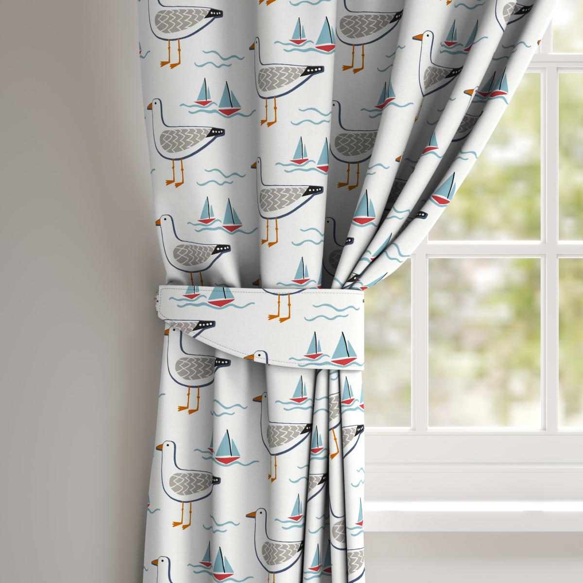 Our tiebacks are crafted with durable materials and is a great way to complement and finish off your Made to Measure curtains. The Coastal Gull fabric evokes a nautical feel with a typical coastal resort scene and showcases a fun seagull and sailboat pattern. Our Web Exclusive Coastal range features 9 beautiful, unique designs for curtains, upon a 100% cotton fabric base, and includes a wide range of styles. Introducing bright and breezy seaside designs into your décor, like Lundy, Gulls, Ocean Yatch, Clovley, Salcombe Stipe and Seaton Stripe, will create a stunning, colourful focal point in any room. 100% natural fibres like cotton are kinder to the environment, as well as to our skin, being naturally hypoallergenic, meaning they are ideal for sensitive and allergy-prone skin, as well as having unique anti-bacterial qualities. You can feel confident that our Coastal range will be gentle to the environment, and to those who may sit close. Please note:. Our Made to Measure Tieback is sold as a single, for a pair you will need to add 2 to your basket. Need some support with your creating Made to Measure tieback? Feel free to book an appointment with one of our experts. Just. Online Only:. This product is only available to order online. Our expert virtual consultants can provide advice on measuring/fitting and style tips and our free samples can be ordered online to be delivered straight to your home to help you choose a fabric that's right for you. Once you're happy, simply place your order online and we'll do the rest.