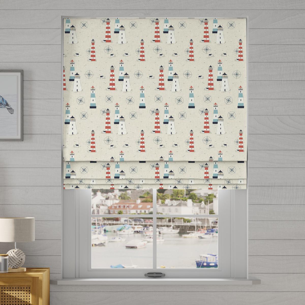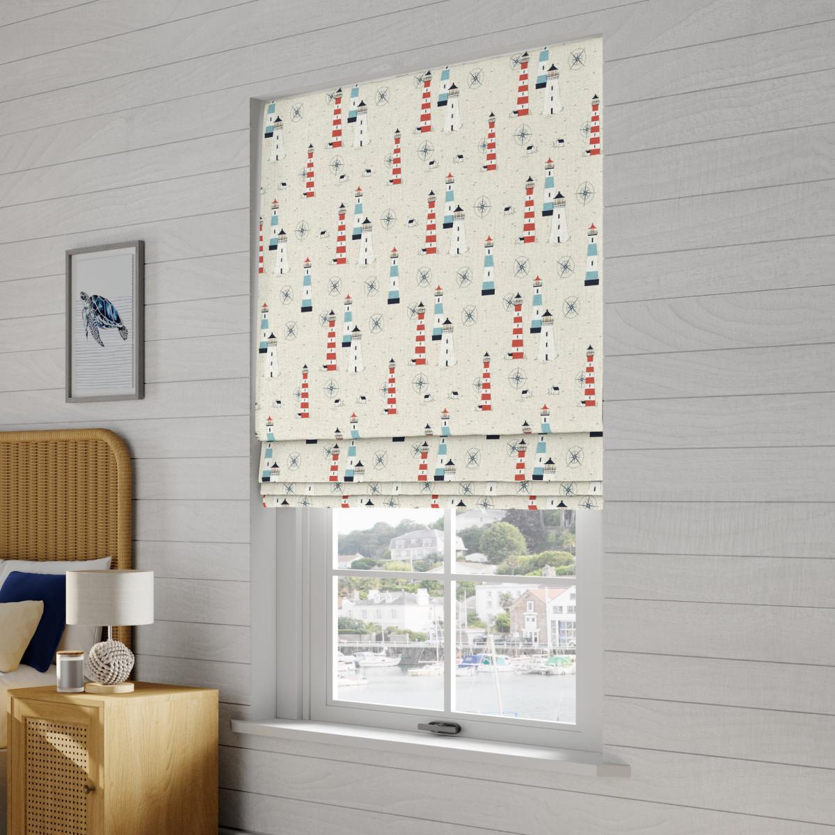 Treat yourself to a little escape with this beautifully light and airy coastal design. Lundy is inspired by the stunning lighthouses along the British southwest coast that have assisted safe passage to mariners over many centuries. Classic coastal colours pop against the unintrusive pale background for a fun yet calming contrast in any home. Our Web Exclusive Coastal range features 9 beautiful, unique designs for curtains, upon a 100% cotton fabric base, and includes a wide range of styles. Introducing bright and breezy seaside designs into your décor, like Lundy, Gulls, Ocean Yatch, Clovley, Salcombe Stipe and Seaton Stripe, will create a stunning, colourful focal point in any room. 100% natural fibres like cotton are kinder to the environment, as well as to our skin, being naturally hypoallergenic, meaning they are ideal for sensitive and allergy-prone skin, as well as having unique anti-bacterial qualities. You can feel confident that our Coastal range will be gentle to the environment, and to those who may sit close. Choosing your lining:. Choosing your fitting type:. ;. Choosing which side you’d like the operating chain:. Child Safety:. We add clips to the back of our roman blinds to attach the cords to the fabric. They also double up as a child safety feature. If pressure is exerted the clips will detach to prevent the risk of strangulation. Please read our. Blinds Safety Guide. For more information. If the clips detach accidentally during normal use, they can be easily re-clipped back into place. Online Only:. This product is only available to order online. Our expert virtual consultants can provide advice on measuring/fitting and style tips and our free samples can be ordered online to be delivered straight to your home to help you choose a fabric that's right for you. Once you're happy, simply place your order online and we'll do the rest.