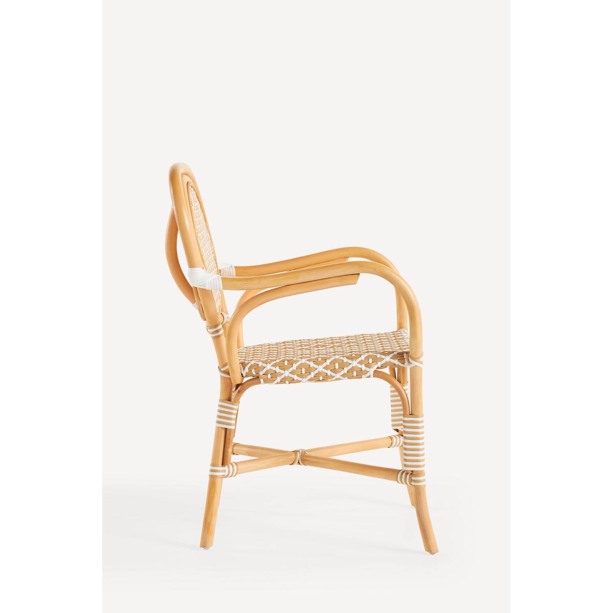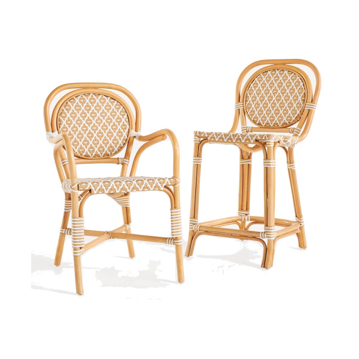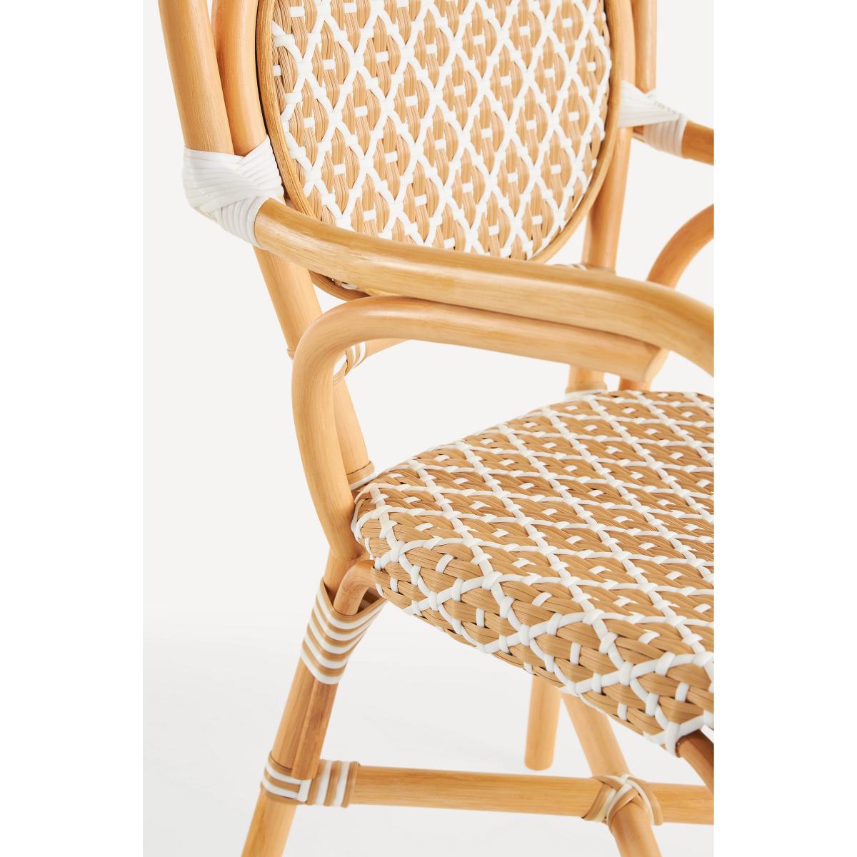 Calling to mind the sidewalk cafes of Paris, this set of two rattan bistro chairs offer a sophisticated touch to sunrooms and outdoor verandas alike. * Set of two * Suitable for indoor or outdoor use * Woven synthetic rattan * Store indoors during inclement weather or when not in use * When placing rattan outside, expect the solid rattan pole and rattan peel to slightly grey and gather dirt, dust, or moss * Wash with a high-pressure combination of water and soap flakes or mild detergent * Natural materials are expected to grey or patina over time * Imported
