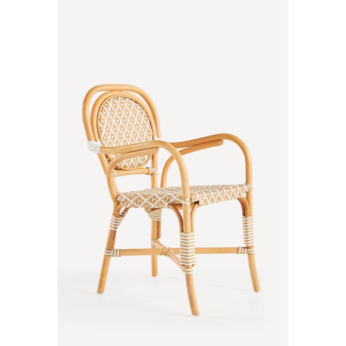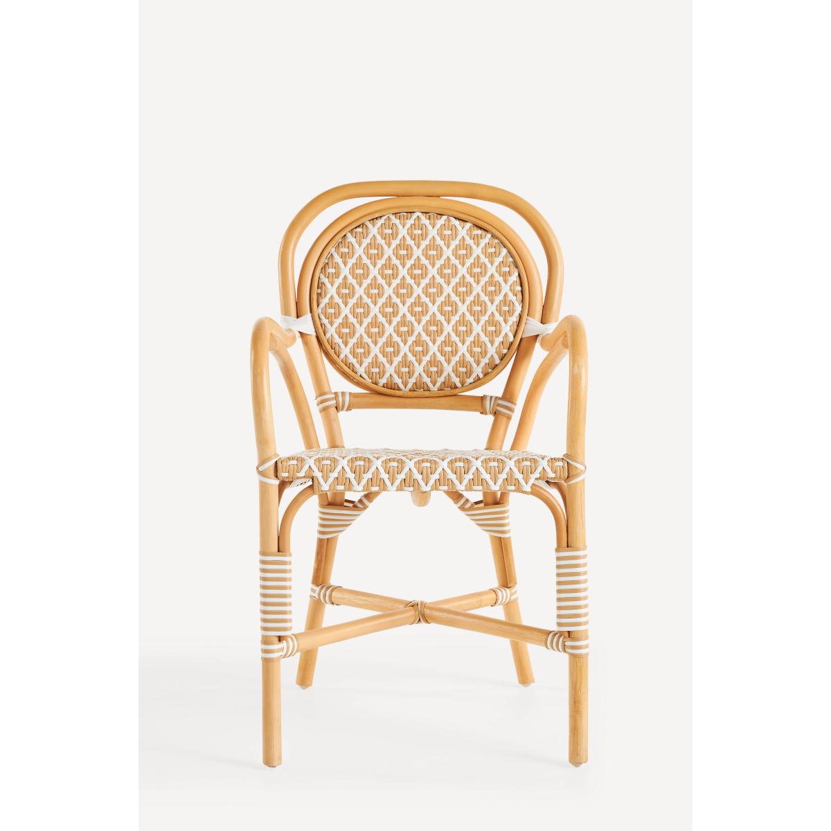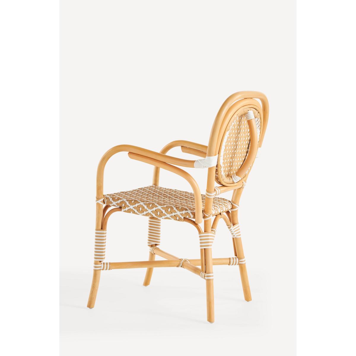 Calling to mind the sidewalk cafes of Paris, this set of two rattan bistro chairs offer a sophisticated touch to sunrooms and outdoor verandas alike. * Set of two * Suitable for indoor or outdoor use * Woven synthetic rattan * Store indoors during inclement weather or when not in use * When placing rattan outside, expect the solid rattan pole and rattan peel to slightly grey and gather dirt, dust, or moss * Wash with a high-pressure combination of water and soap flakes or mild detergent * Natural materials are expected to grey or patina over time * Imported
