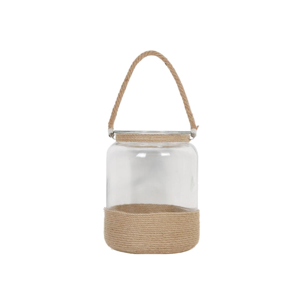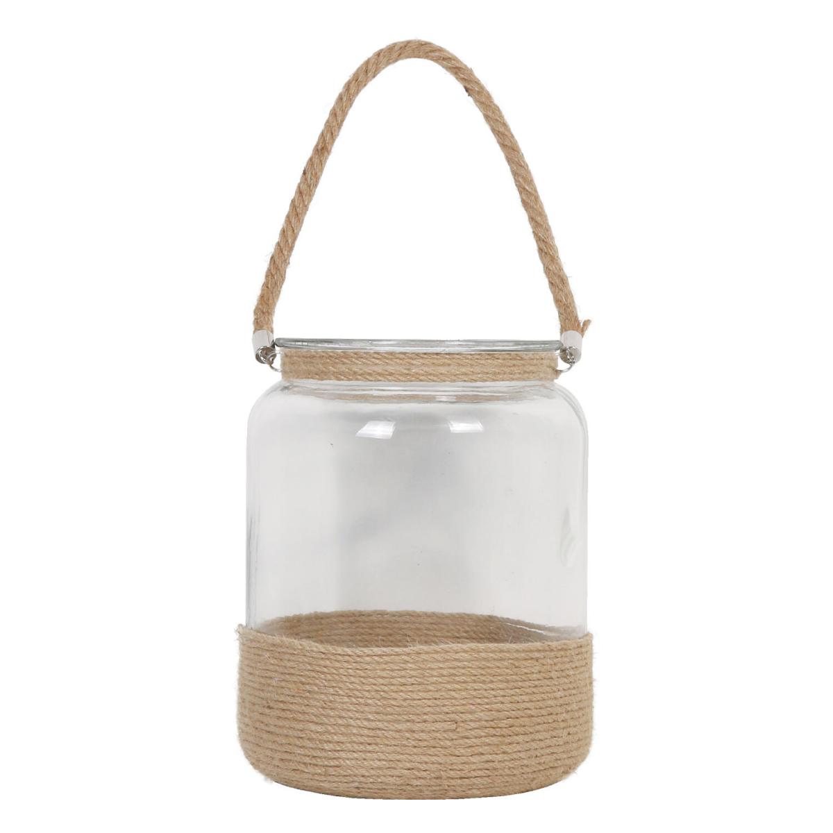 Add a nautical element to your space with this beautiful Coastal Rope Hurricane. The hurricane is a standard glass jar that suits any home or room, accented with a neatly laid winding of thin rope, adding a touch of natural charm. Finished with a matching rope handle, this hurricane is perfect for hanging in the living room or bedroom and can be used with pillar candles, votives, and tealights to create a warm and cosy effect through your space.