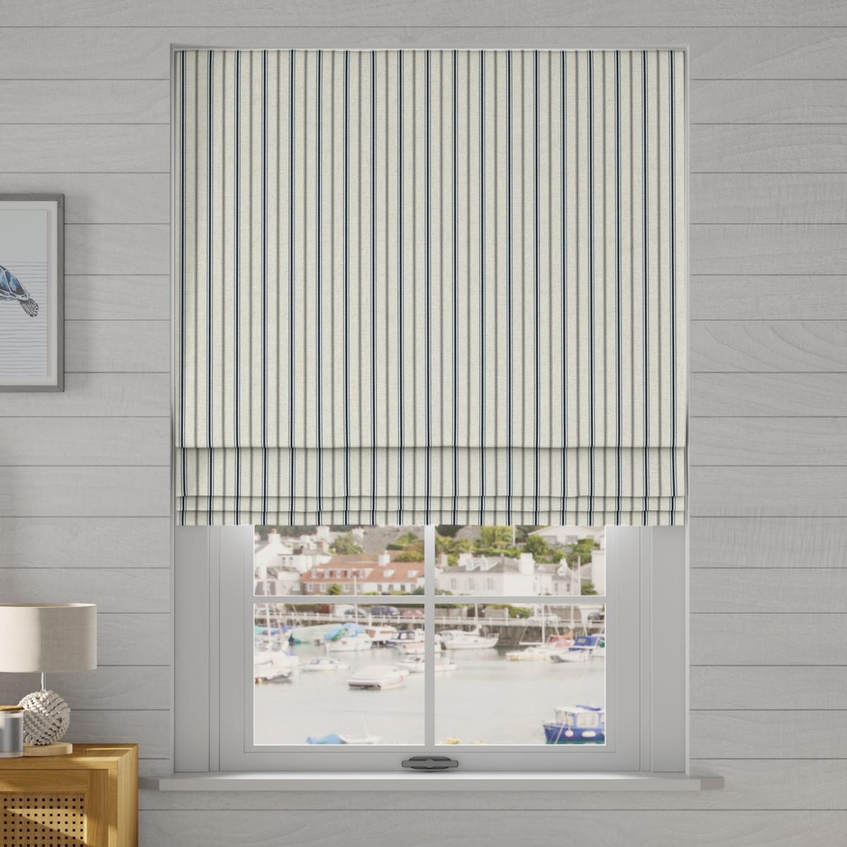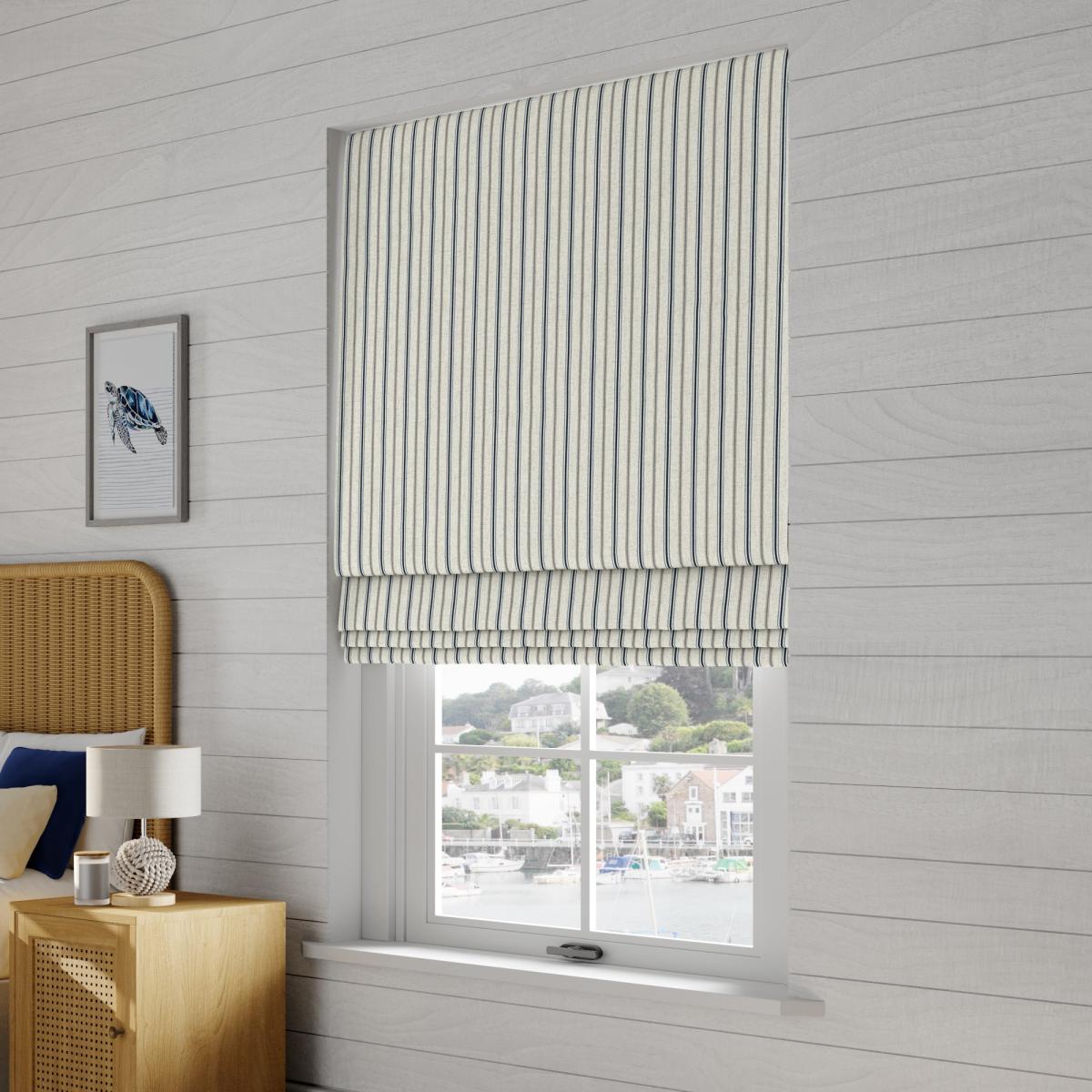 Clean, classic, timeless, and crisp, this stunning understated striped design exudes a nautical look and colour scheme, inspired by holidays on the Devon coast. Sitting on a quiet, unintrusive pale background, this fabric brings peace and tranquillity into any room. Our Web Exclusive Coastal range features 9 beautiful, unique designs for curtains, upon a 100% cotton fabric base, and includes a wide range of styles. Introducing bright and breezy seaside designs into your décor, like Lundy, Gulls, Ocean Yatch, Clovley, Salcombe Stipe and Seaton Stripe, will create a stunning, colourful focal point in any room. 100% natural fibres like cotton are kinder to the environment, as well as to our skin, being naturally hypoallergenic, meaning they are ideal for sensitive and allergy-prone skin, as well as having unique anti-bacterial qualities. You can feel confident that our Coastal range will be gentle to the environment, and to those who may sit close. Choosing your lining:. Choosing your fitting type:. ;. Choosing which side you’d like the operating chain:. Child Safety:. We add clips to the back of our roman blinds to attach the cords to the fabric. They also double up as a child safety feature. If pressure is exerted the clips will detach to prevent the risk of strangulation. Please read our. Blinds Safety Guide. For more information. If the clips detach accidentally during normal use, they can be easily re-clipped back into place. Online Only:. This product is only available to order online. Our expert virtual consultants can provide advice on measuring/fitting and style tips and our free samples can be ordered online to be delivered straight to your home to help you choose a fabric that's right for you. Once you're happy, simply place your order online and we'll do the rest.