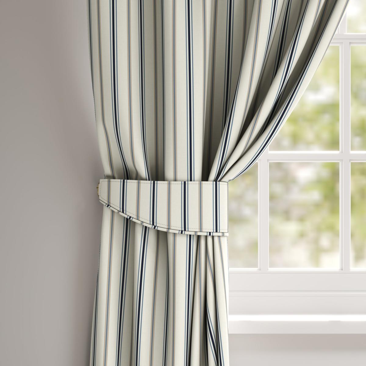 Our tiebacks are crafted with durable materials and is a great way to complement and finish off your Made to Measure curtains. This stunning understated striped design exudes a nautical look and colour scheme, inspired by holidays on the Devon coast. Our Web Exclusive Coastal range features 9 beautiful, unique designs for curtains, upon a 100% cotton fabric base, and includes a wide range of styles. Introducing bright and breezy seaside designs into your décor, like Lundy, Gulls, Ocean Yatch, Clovley, Salcombe Stipe and Seaton Stripe, will create a stunning, colourful focal point in any room. 100% natural fibres like cotton are kinder to the environment, as well as to our skin, being naturally hypoallergenic, meaning they are ideal for sensitive and allergy-prone skin, as well as having unique anti-bacterial qualities. You can feel confident that our Coastal range will be gentle to the environment, and to those who may sit close. Please note:. Our Made to Measure Tieback is sold as a single, for a pair you will need to add 2 to your basket. Need some support with your creating Made to Measure tieback? Feel free to book an appointment with one of our experts. Just. Online Only:. This product is only available to order online. Our expert virtual consultants can provide advice on measuring/fitting and style tips and our free samples can be ordered online to be delivered straight to your home to help you choose a fabric that's right for you. Once you're happy, simply place your order online and we'll do the rest.
