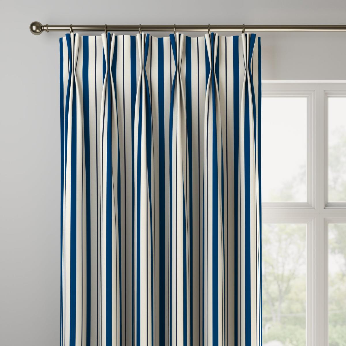 The Seaton Stripe fabric is designed with clean, crisp stripes that exudes a nautical look and feel. Inspired by holidays on the Devon coast, the stripe design contrasts against the quiet and unintrusive pale 100% cotton fabric background. Our Web Exclusive Coastal range features 9 beautiful, unique designs for curtains, upon a 100% cotton fabric base, and includes a wide range of styles. Introducing bright and breezy seaside designs into your décor, like Lundy, Gulls, Ocean Yatch, Clovley, Salcombe Stipe and Seaton Stripe, will create a stunning, colourful focal point in any room. 100% natural fibres like cotton are kinder to the environment, as well as to our skin, being naturally hypoallergenic, meaning they are ideal for sensitive and allergy-prone skin, as well as having unique anti-bacterial qualities. You can feel confident that our Coastal range will be gentle to the environment, and to those who may sit close. For windows that cannot wait, shop our range of. Ready Made Curtains. Please note: you measure for pinch pleat curtains in the same way as pencil pleat curtains. Online Only:. This product is only available to order online. Our expert virtual consultants can provide advice on measuring/fitting and style tips and our free samples can be ordered online to be delivered straight to your home to help you choose a fabric that's right for you. Once you're happy, simply place your order online and we'll do the rest.