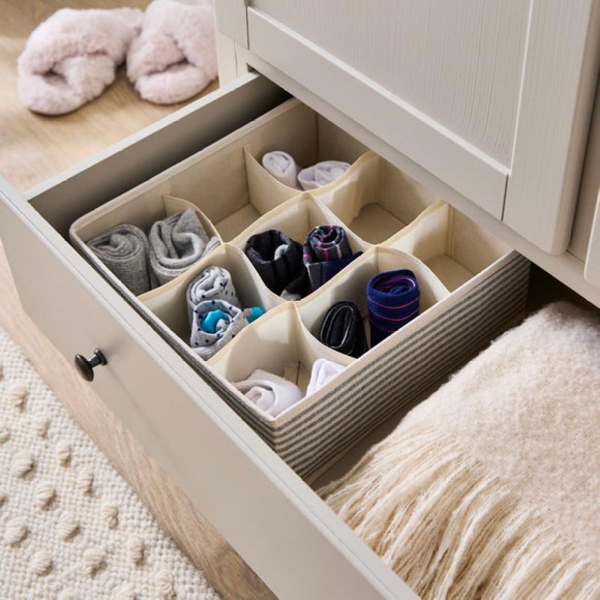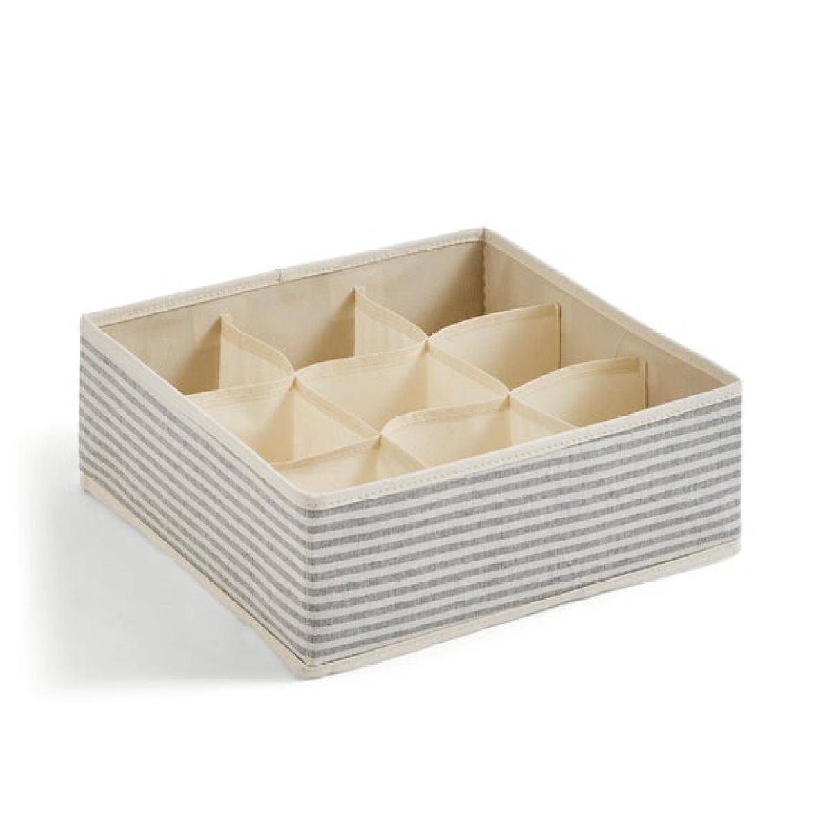 * Coastal stripe design * 9 part divider * Collapsible Maximise storage with this 9-cube organiser, featuring a collapsible design and sturdy frame. The striped fabric adds a touch of coastal charm to any room.