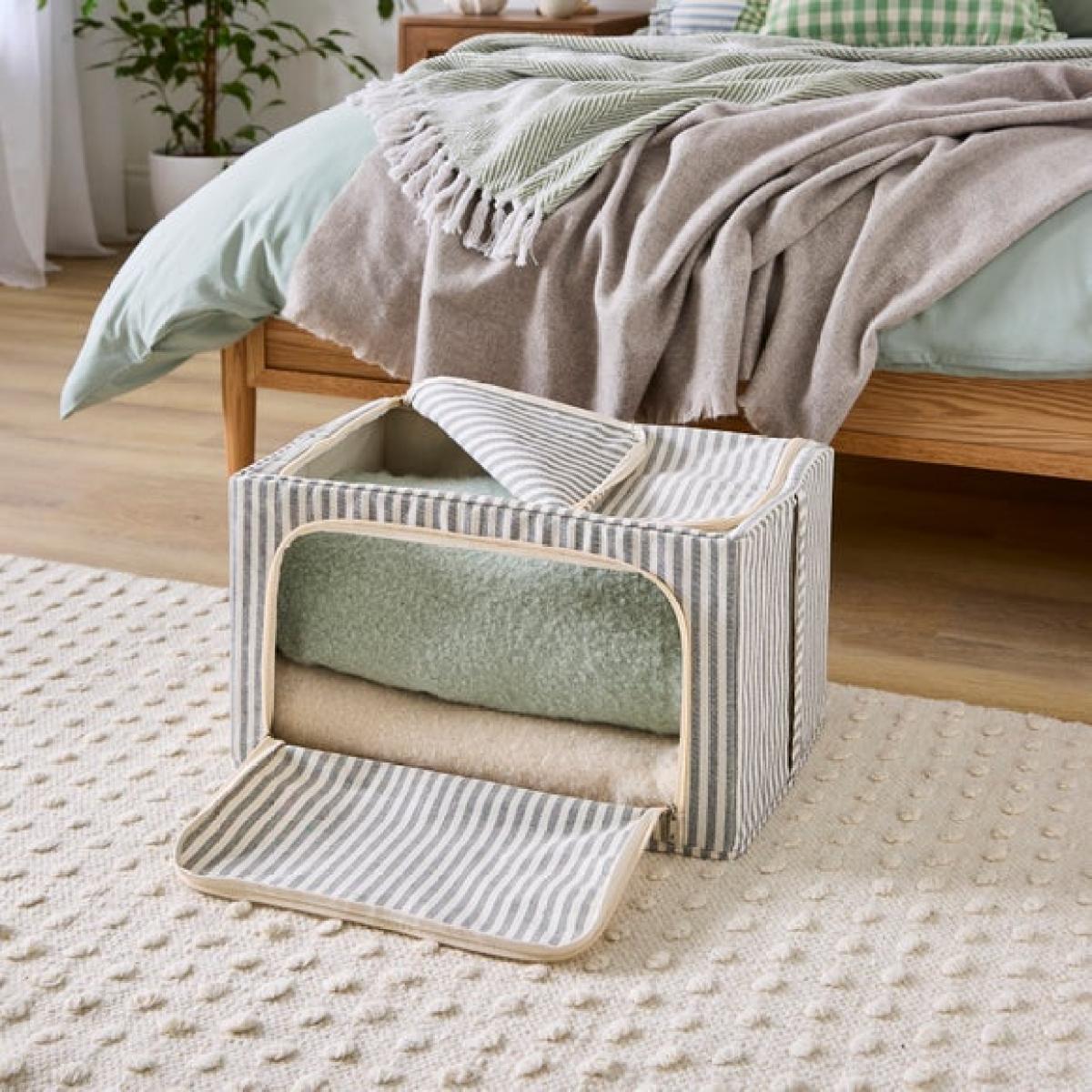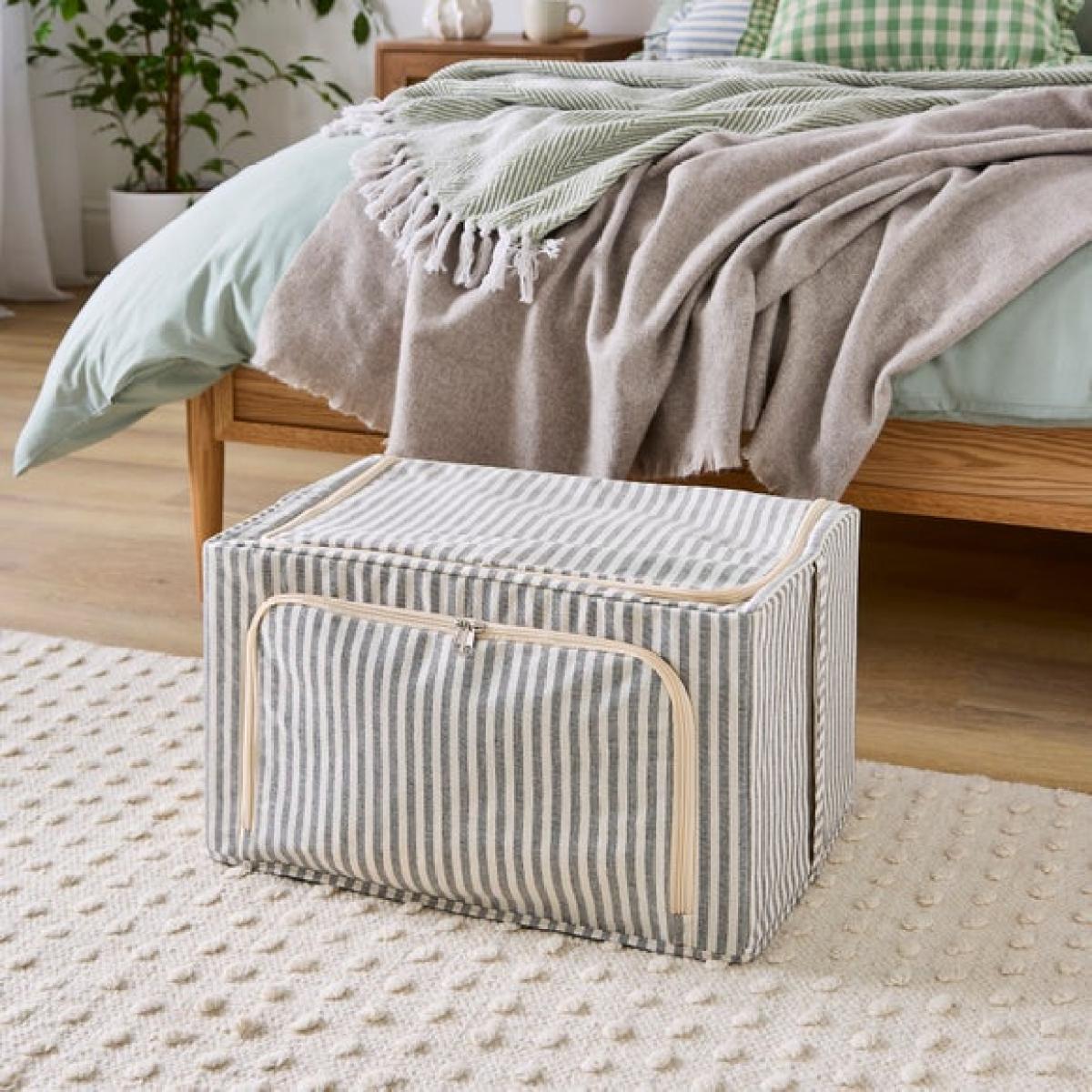 * Coastal stripe design * Fabric material * Collapsible * Handle loops Maximise storage with this 9-cube organiser, featuring a collapsible design and sturdy frame. The striped fabric adds a touch of coastal charm to any room.