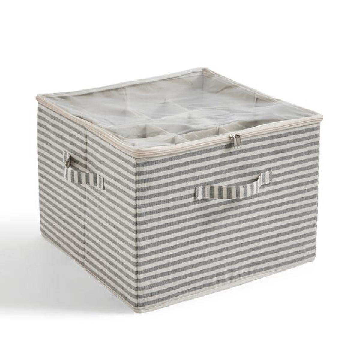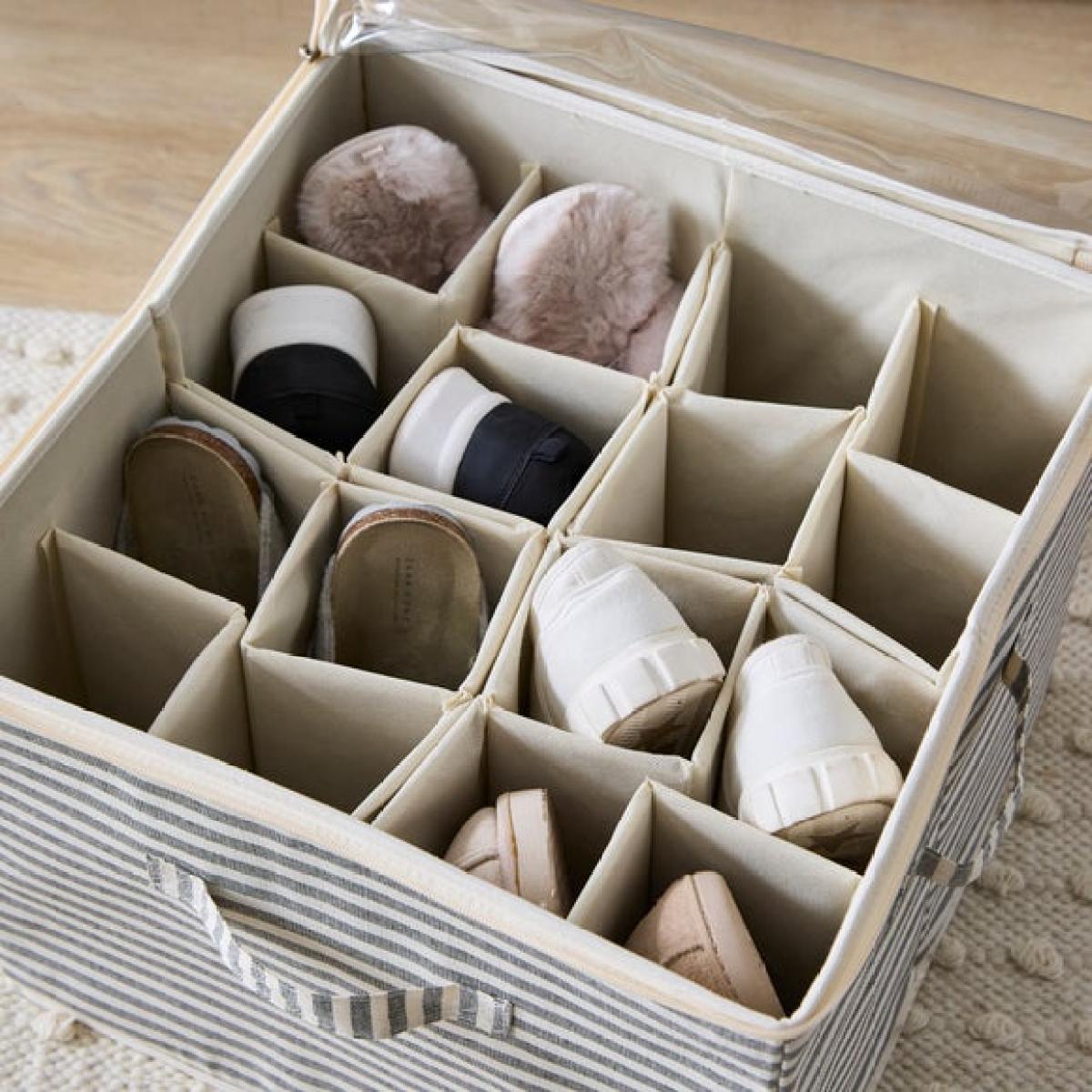 * Coastal stripe design * Includes shoe inserts * Collapsable * Includes handle loop Keep your footwear neatly stored in this collapsible shoe storage box. Featuring a sturdy frame and striped fabric design, it’s the perfect blend of style and function.