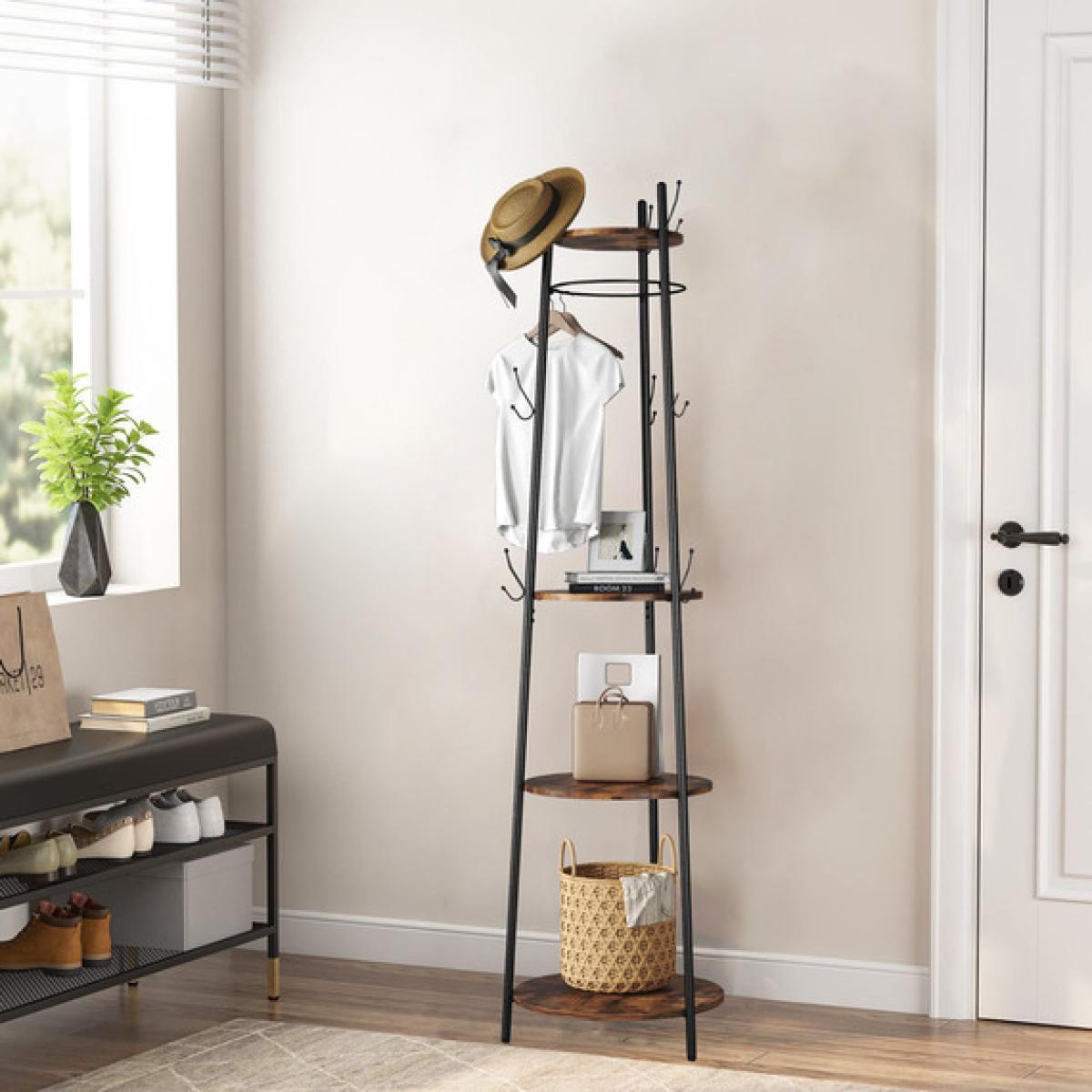 Coat Rack Freestanding with 3 Storage Shelves and 6 Hooks - Brown