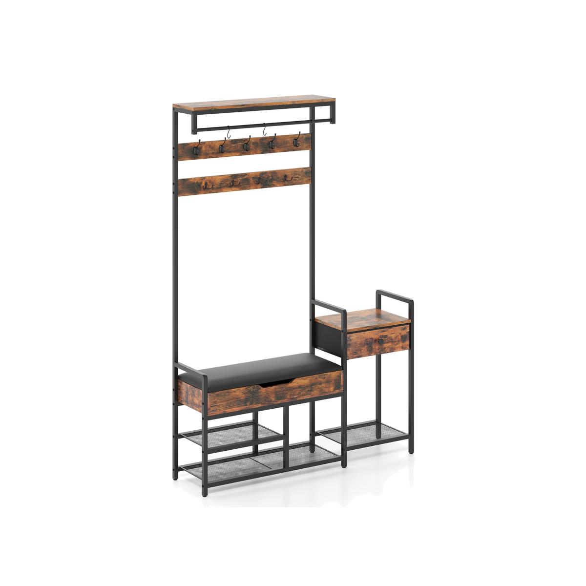 Elevate your entryway with this multifunctional hall tree! The hall tree includes a coat rack, shoe rack, and foldable fabric drawer for storage, along with sturdy metal hooks for convenience. Moreover, the soft padded shoe bench offers a convenient solution for organizing your footwear while also providing a stylish seating option. The bench has a roomy storage space under the seat, ideal for storing sundries.