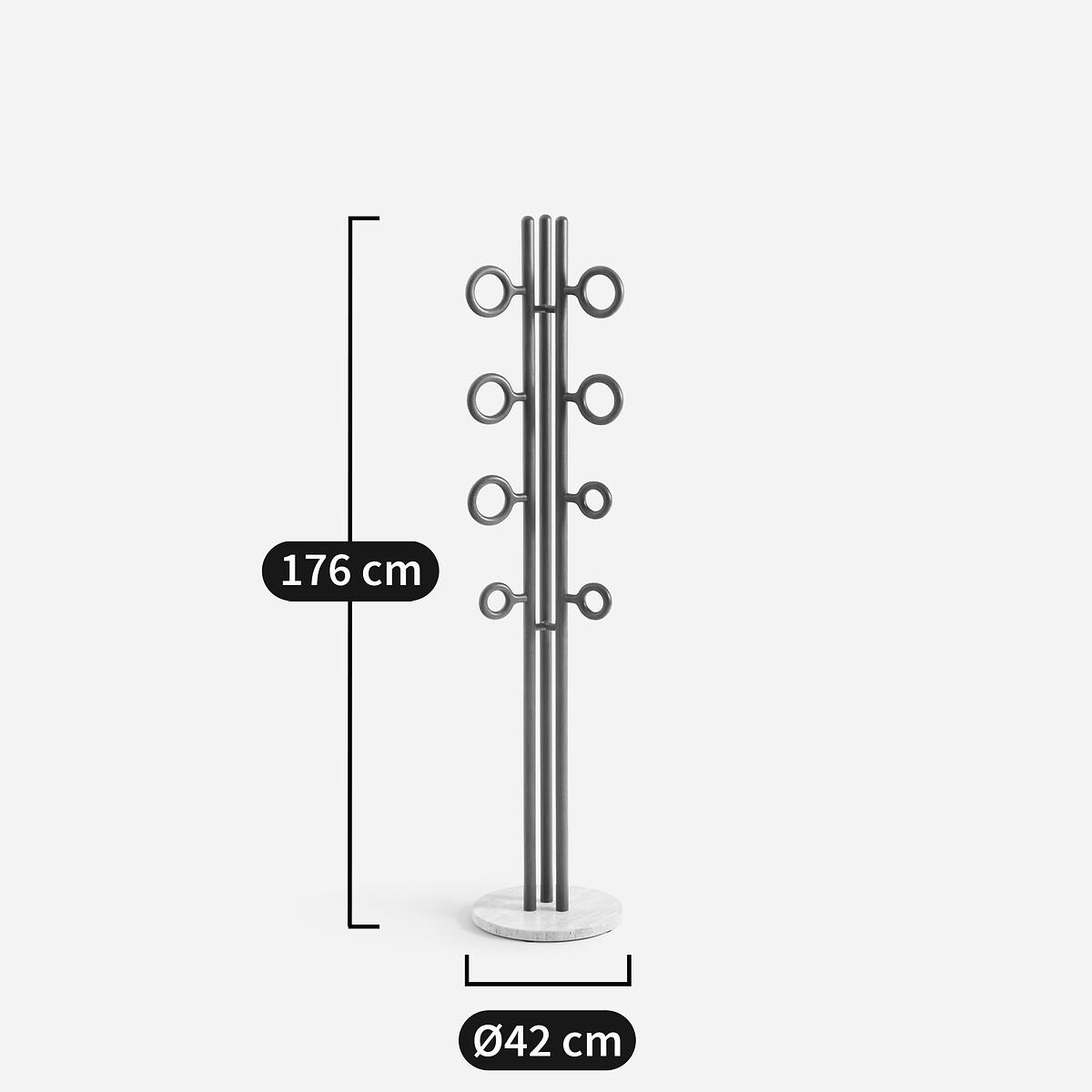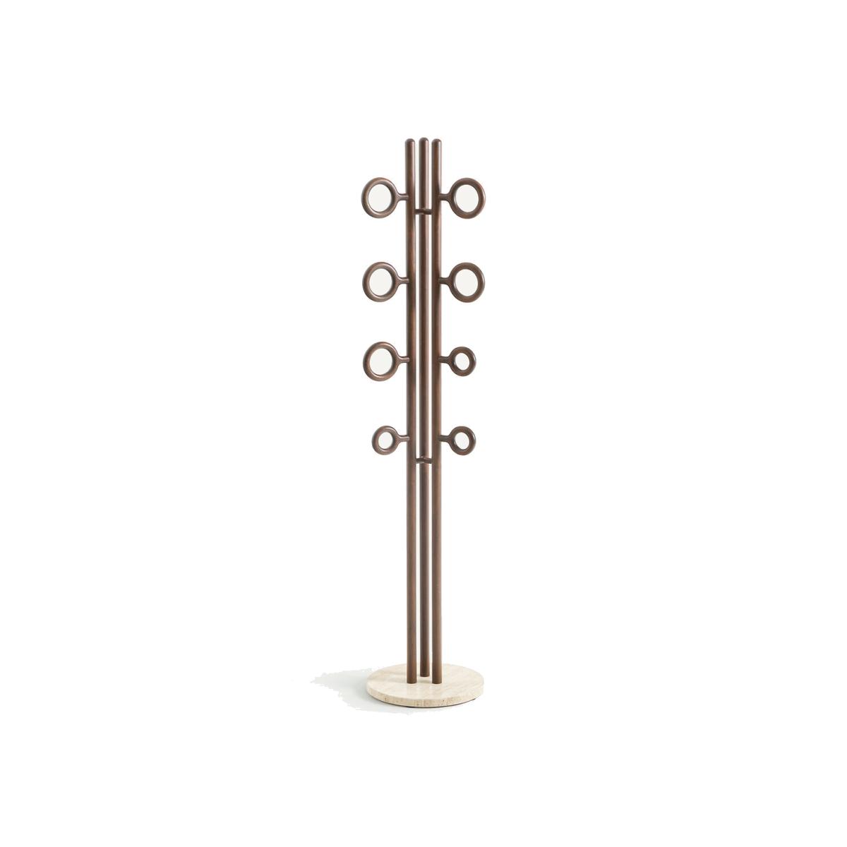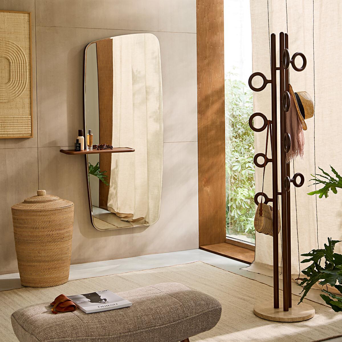A sculptural object in its own right, the Nayati coat stand is made of walnut-stained solid elm and travertine. Inspired by the clear and refined line of Thonet chairs, Nayati is a decorative and functional piece with the AMPM signature. Product Details • 3 poles linked by 2 braces, 12 rings • Structure and rings in walnut-stained solid elm • FSC® certified wood • Nitrocellulose finish • Travertine base, each piece is unique. Quality Info • Wood is a living material. The differences in shades, grains and knots reinforce its character. Over time it may crack slightly. It is a natural process due to variations in temperature and humidity.. Care Advice • Travertine is a porous and heat sensitive material. Care information: Immediately wipe up any spilled liquid with a white cloth dipped in lukewarm water and wrung out. Dimensions • Diameter: 42cm • Height: 176cmDelivery:. Sold pre-assembled. Available for home delivery. Note! Please ensure all passageways and doorways are wide enough. Dimensions and weight of parcel1 parcel • W46 x H185 x D45cm, 25kg