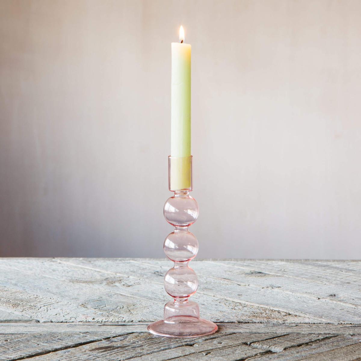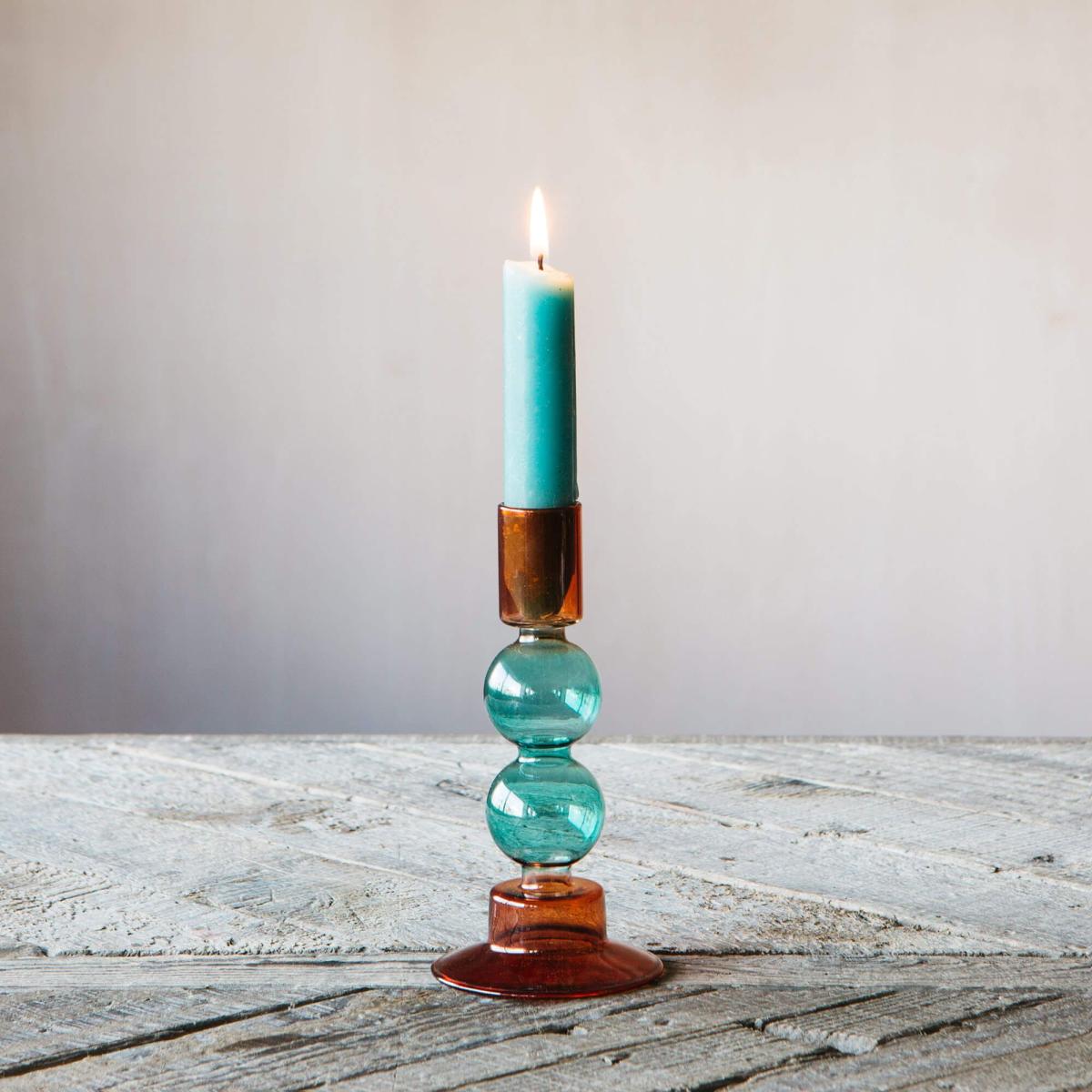 Perfect for holding rainbow coloured dining candles, this abstract glass candle holder features a curvy bubble silhouette and a pretty coloured tint in one or two tones. Mix and match for a colourful candle collection.