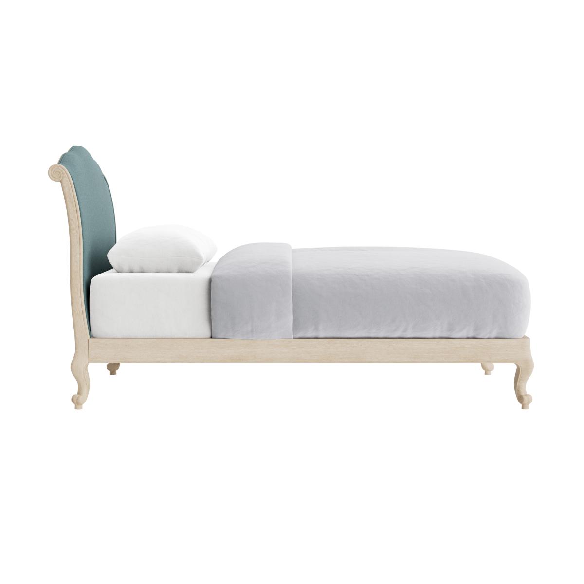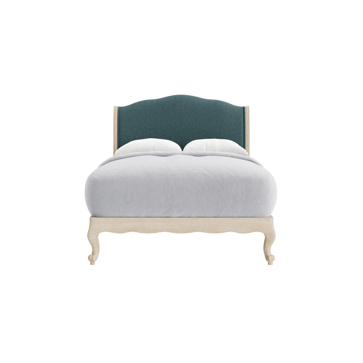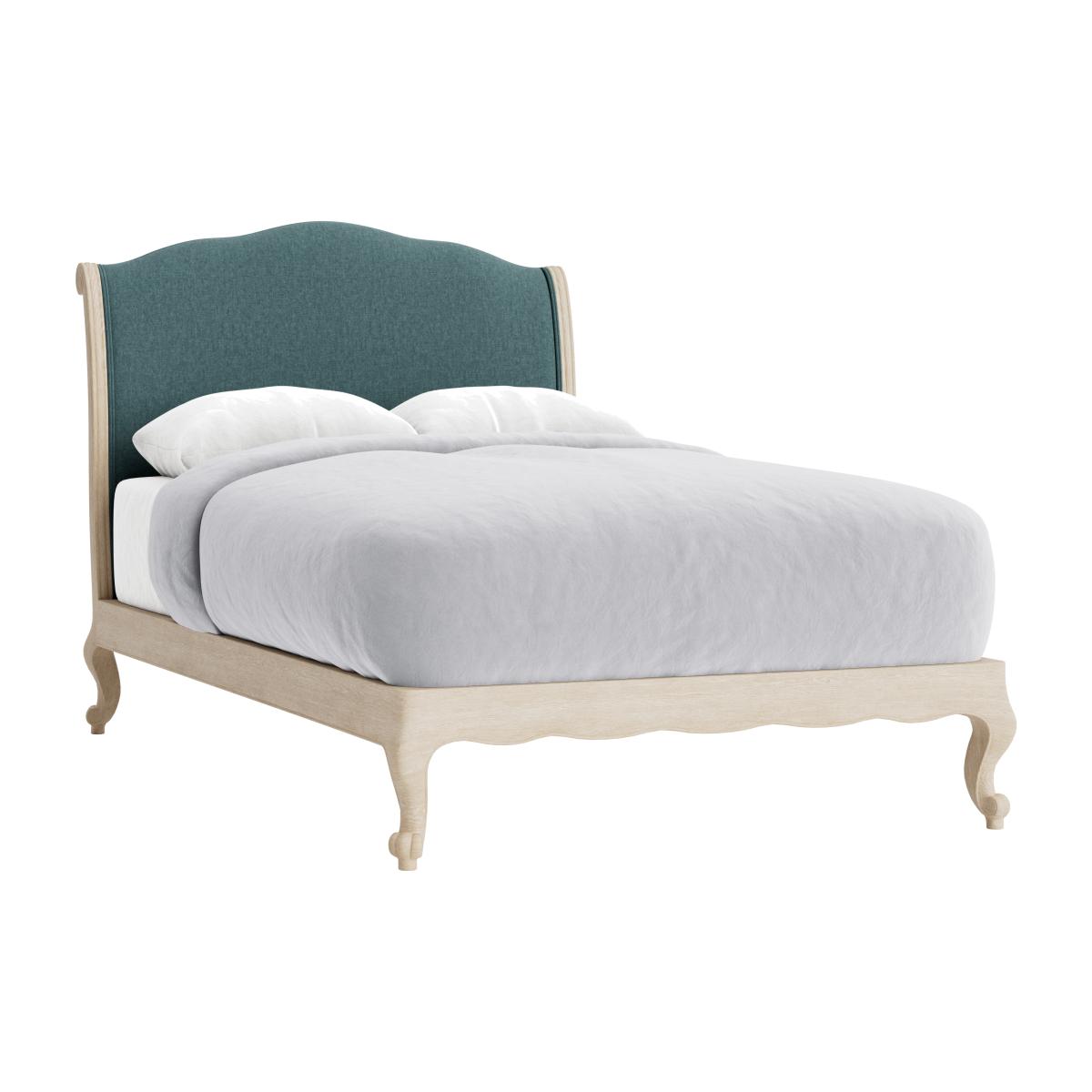 I love this bed frame for its elegant yet understated design, making it a versatile piece that can adapt to various interior styles from classic to contemporary. The gentle curves of the legs and the soft teal upholstered headboard add a touch of sophistication without overpowering the space. It works well in bedrooms aiming for a cosy, boutique hotel feel or a relaxed vintage look. Practical styling tips include pairing it with crisp white or neutral linens to let the colour pop, and adding textured cushions or a throw to enhance comfort and visual interest. This piece also lends itself to layered lighting with bedside lamps or wall sconces, creating a warm, inviting atmosphere.