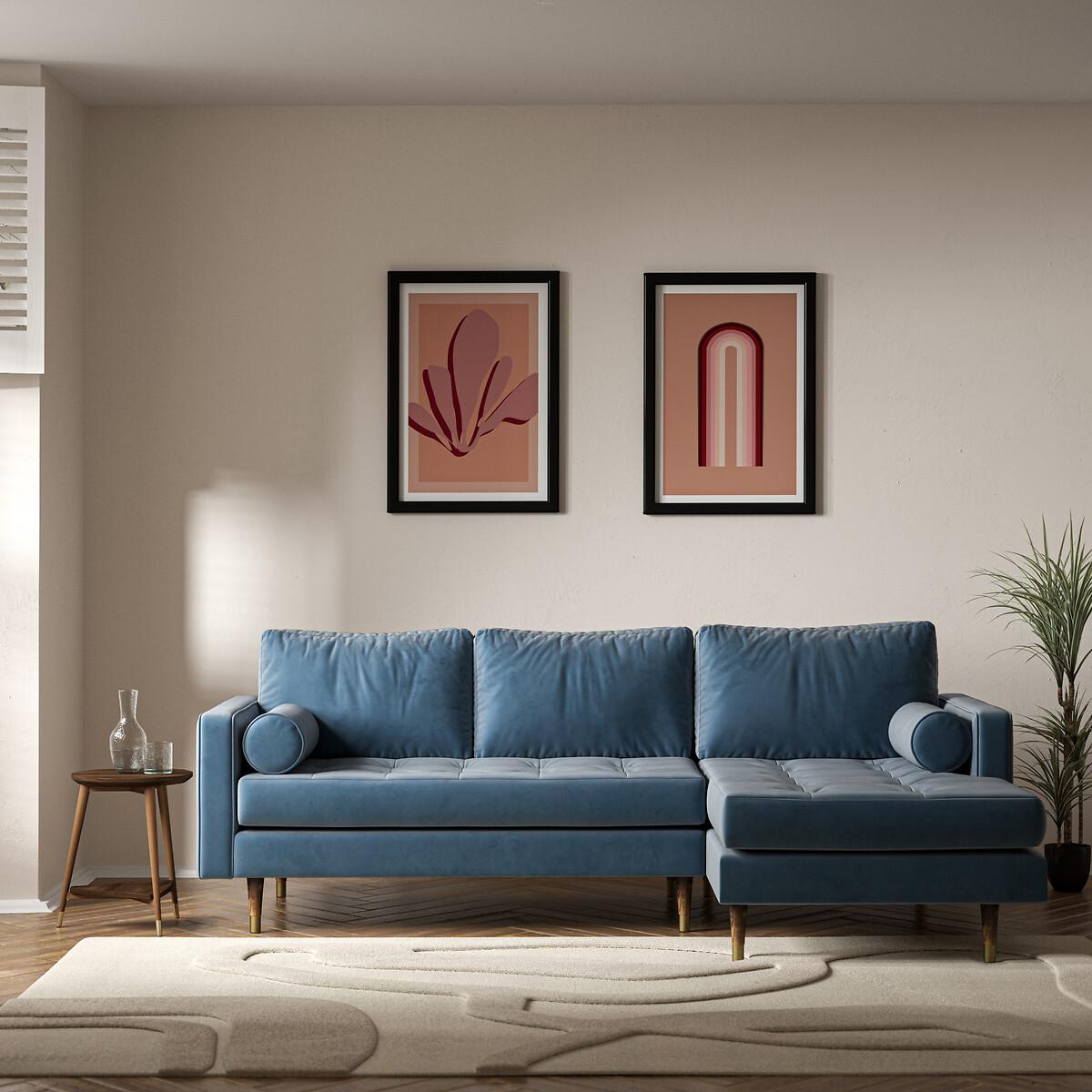 Put your feet up and S-T-R-E-T-C-H. With its cool buttoned seats and elegant low back the Coco is the epitome of 1950’s glamour. Throw in some rounded bolster cushions and brass tipped feet and you have the ultimate in Mid-century modern style. Decadent, opulent, vintage perfection with a Hollywood twist. Choose from our soft brushed fabric for ultimate cosiness or velvet for luxe living. The Coco is available as a 2 seater,3 seater, corner chaise sofa or armchair. Product details• Velvet - An elegant velvet with a dense and matte finish, perfect for those wanting a rich and luxurious look. A flat finish pile makes it difficult for the material to snag – ideal if you live with pets and sure to prove durable for years to come. Check it's right for you - order a FREE swatch above.• Created with medium density foam fillings for a sofa with a level of comfort suitable for most. • A foam filled seat with button detailing provides a sturdy and supportive seat• Fibre backs provide extra softness and give you that "sink in" feeling.• Two round bolster scatter cushions with piped edges add extra arm comfort and the perfect retro touch.• Just flip to freshen up - both the seat cushions and back cushions are fully reversible so it's easy to keep your sofa looking its best.• The back cushion covers are removable (zip fastening). The seat cushion is not removable due to button finishes. • FSC® solid beech hardwood frame - made of wood from responsibly managed forests that provide environmental, social and economic benefits.• Tapered feet crafted entirely from solid wood ensure durability and stability.• Removable feet.• Lovingly handmade in the UK.All our made to order sofas are carefully manufactured in the UK.Each hardwood frame is dowelled, glued, and screwed before being paired with the finest fabrics and fillings. And it doesn't stop there - for customer peace of mind and safety, all frames and fabrics are rigorously examined, inspected, and tested to the highest standards. All filling material(s) and covering fabric(s) meet the requirements for resistance to cigarette and match ignition in the 1988 safety regulations. This sofa comes with a 3 year manufacturer warranty from date of delivery (subject to terms and conditions)Product composition• Fabric - Velvet (100% polyester)• Seat Fillings - Foam (Dacron wrapped)• Back Fillings - Fibre• Frame - Beech Hardwood (FSC), OSB (UK origin, FSC)• Feet - Solid Wood. Product Dimensions Overall width: 270 cm. Overall depth: 92/180 cm. Overall height: 90 cm. Seat height: 48 cm. Seat depth: 57 cm. Seat width between the arms: 249 cm. Back height (from base): 71 cm. Back height (from seat): 45 cm. Arm height (from floor): 66 cm. Arm height (from seat): 18 cm Clearance to floor (leg height): 19 cm. Small bolster cushions x 2: L24 cm x W17 cm. Please remember to measure your available space before ordering to be sure your sofa will fit. Don't forget to measure accessways and corners, and consider any obstacles. Package DimensionsL18. 1 cm x W151 cm x H73 cm, Weight 86 kg. This product will be dispatched by one of our trusted suppliers. You’ll be contacted by their selected courier about your delivery. Your product will be delivered to your room of choice. Feet may be assembled on arrival. BELFI01
