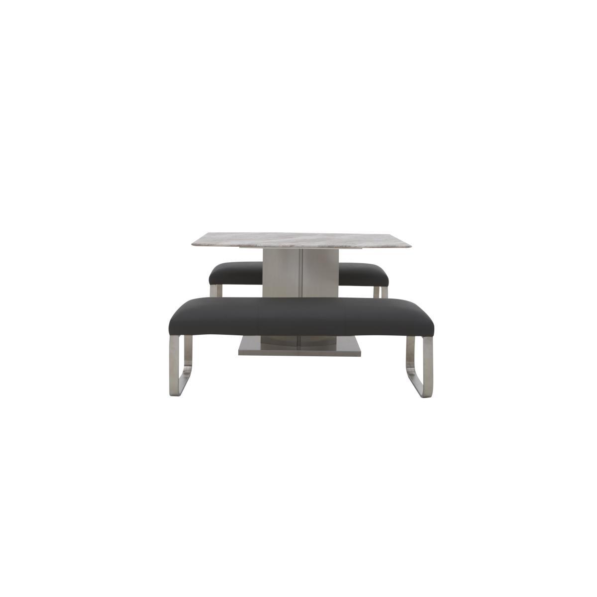 The stunning Cocoon dining collection delivers designer flair alongside useful practicality. The beautifully-crafted dining table is a real showstopper. Set on a brushed stainless steel pedestal base, it features a solid white marble top with a perfectly-patterned matt surface created through a unique finishing process. Seating options in this collection are extensive and versatile. There are three different dining benches and a cantilever dining chair. Mix and match to create the ideal dining set or make life even easier by choosing one of the ready-made Cocoon dining sets. Fantastic value and only at Furniture Village. Cool and contemporary style for today’s dining spaces. Matt-finish solid marble table with two dining benches. Fantastic value and exclusive to Furniture Village. Great for entertaining, perfect for small space dining, and ideal for anyone who loves contemporary style, the Cocoon dining table and 2 low benches dining set is fantastic value - and only at Furniture Village. The very cool Cocoon dining table is made of solid marble and has a beautifully smooth matt-finish marble-effect surface created through a unique process that ensures gorgeous uniform marble patterning as well as long lasting durability. The pedestal base is made of brushed stainless steel. The two dining benches are comfortably cushioned and upholstered in easy-care faux leather in charcoal grey and are set on U-shaped brushed stainless steel legs. They’re a fantastic choice for a compact kitchen diner as each seats up to three but takes up about the same space as two dining chairs. The Cocoon dining table and 2 low benches dining set is one of several dining sets in the Cocoon collection. The range also offers four different seating options that partner with the Cocoon table so you can create the dining set that’s a perfect fit for you family and your home. Please note. This dining table is extremely heavy – please take care when moving it. Dining benches will soften with use.