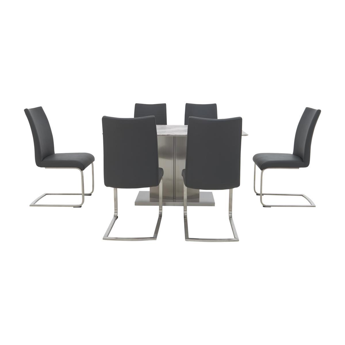 The stunning Cocoon dining collection delivers designer flair alongside useful practicality. The beautifully-crafted dining table is a real showstopper. Set on a brushed stainless steel pedestal base, it features a solid white marble top with a perfectly-patterned matt surface created through a unique finishing process. Seating options in this collection are extensive and versatile. There are three different dining benches and a cantilever dining chair. Mix and match to create the ideal dining set or make life even easier by choosing one of the ready-made Cocoon dining sets. Fantastic value and only at Furniture Village. Cool and contemporary style for today’s dining spaces. Matt-finish solid marble table with 6 dining chairs. Fantastic value and exclusive to Furniture Village. The very essence of stylish contemporary dining, the fantastic Cocoon dining table and 6 dining chairs set scores highly for practicality thanks to its compact proportions, beautiful easy-care finishes and incredible value price. The Cocoon dining table is a modern masterpiece thanks to its stunning boat-shaped top of solid marble. A unique finishing process creates a smooth matt surface with uniform marble patterning. The brushed stainless steel pedestal base provides more room to seat more people in comfort. The six contemporary dining chairs are gently curved, well cushioned and fully covered in easy-care upholstery – a charcoal grey faux leather. Cantilever bases are made of brushed stainless steel. The Cocoon dining table and 6 dining chairs dining set is part of the extensive Cocoon dining collection, exclusively available at Furniture Village. The range includes a wide choice of dining sets featuring the Cocoon dining table and different combinations of the three Cocoon dining benches and the dining chair. Every piece is also available to purchase separately so you can build your perfect customised dining set. Please note:. This dining table is extremely heavy – please take care when moving it. The dining bench will soften with use.