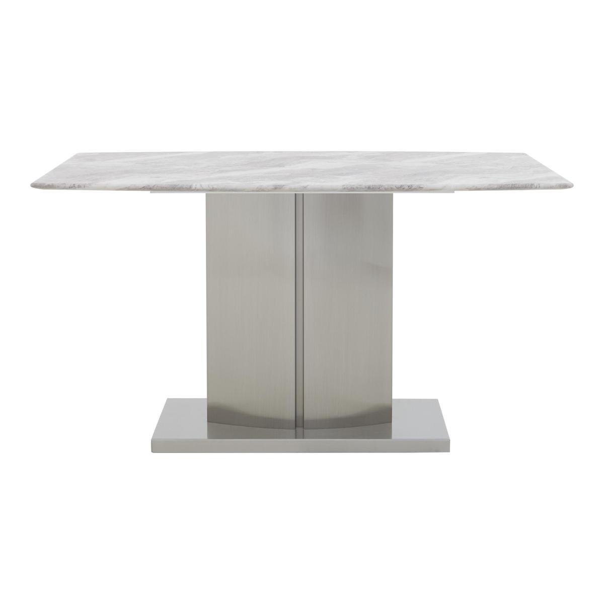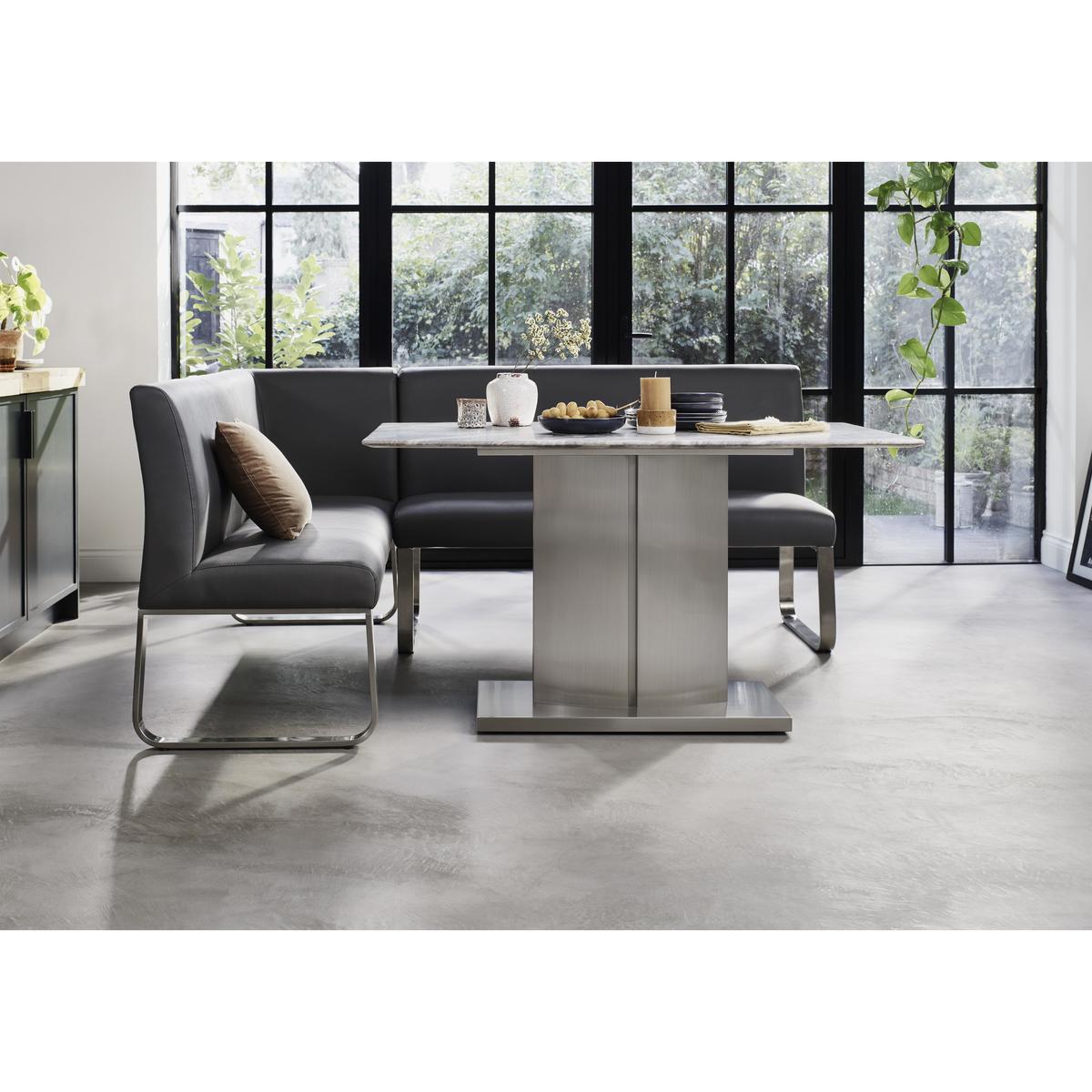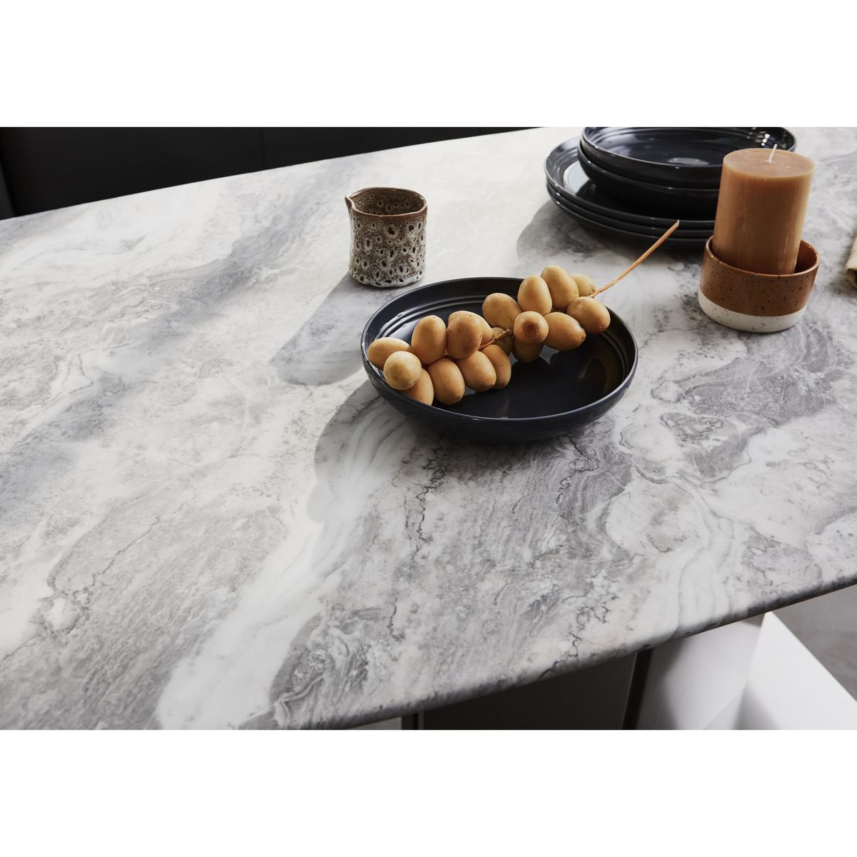 The stunning Cocoon dining collection delivers designer flair alongside useful practicality. The beautifully-crafted dining table is a real showstopper. Set on a brushed stainless steel pedestal base, it features a solid white marble top with a perfectly-patterned matt surface created through a unique finishing process. Seating options in this collection are extensive and versatile. There are three different dining benches and a cantilever dining chair. Mix and match to create the ideal dining set or make life even easier by choosing one of the ready-made Cocoon dining sets. Fantastic value and only at Furniture Village. Cool and contemporary style for today’s dining spaces. Solid white marble table with matt marbled finish and pedestal base. Fantastic value and exclusive to Furniture Village. Functionality needn’t be at the expense of style. And here’s the proof - the beautifully-finished marble Cocoon dining table that’s perfect for every occasion. Accommodating six, this stylish and striking table is made of solid white marble with a cool matt marble-effect surface created through a unique finishing process to ensure beautiful and even patterning – the classic marble look with striking grey swirls and veining – as well as long-lasting durability. The table top is boat-shaped with gently curving sides and is set on a brushed stainless steel pedestal base. Compact in scale yet big on style, it suits dining rooms as well as kitchen diners and is the ideal table for family meals, casual suppers and stylish dinner parties alike. The great-value Cocoon dining table is part of the Cocoon dining collection, only at Furniture Village. The range includes four different seating options – a corner bench, a low bench, a high back bench and a dining chair – so you can mix and match to create the perfect ergonomic seating arrangement for you and your family. Please note. This dining table is extremely heavy – please take care when moving it.