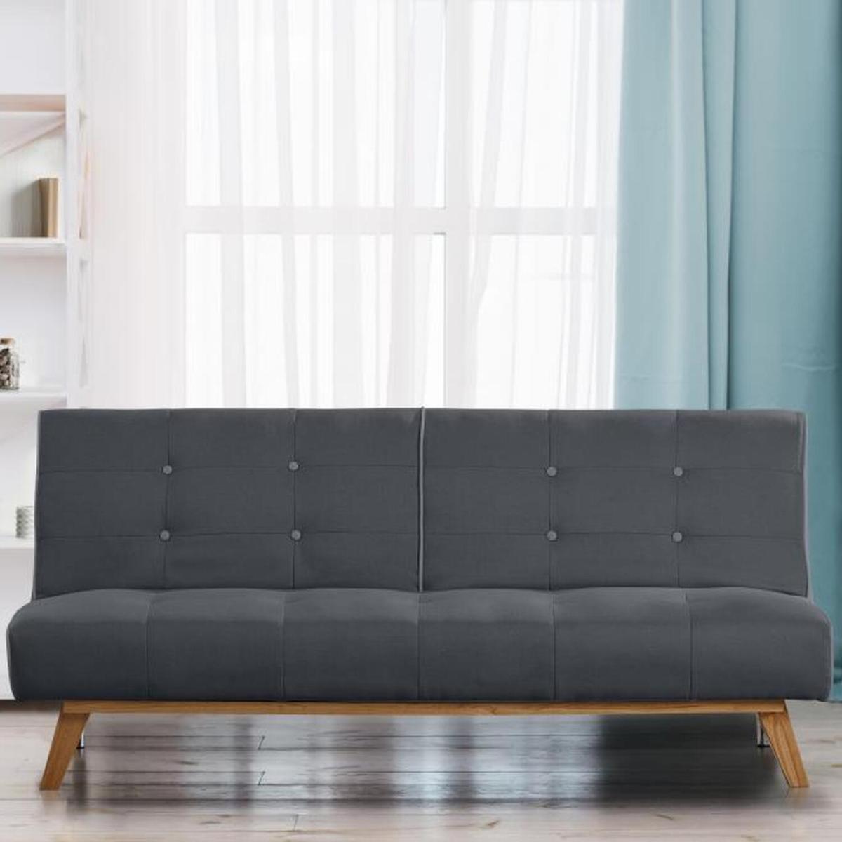 Stylish and practical, this modern fabric sofa bed is a perfect addition for any contemporary home and effortlessly converts from a comfortable 3 seater sofa into an ideal bed for two, perfect for when you have unexpected guests. Finely upholstered in a fashionable woven fabric with an elegant buttoned effect and classic piping detail for a chic, modern look, this sofa is generously padded for a cosy night in. This versatile fold down sofa bed is made with a simple click-clack mechanism allowing it to transform into a comfortable bed in seconds. Simply pull the backrest forward until you hear the click and then lay it down into a flatbed. Convert into a sofa again by raising the backrest until it clicks into place. This sofa also has the added feature of a reclining setting for extra comfort.