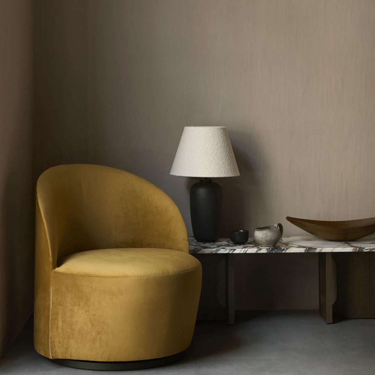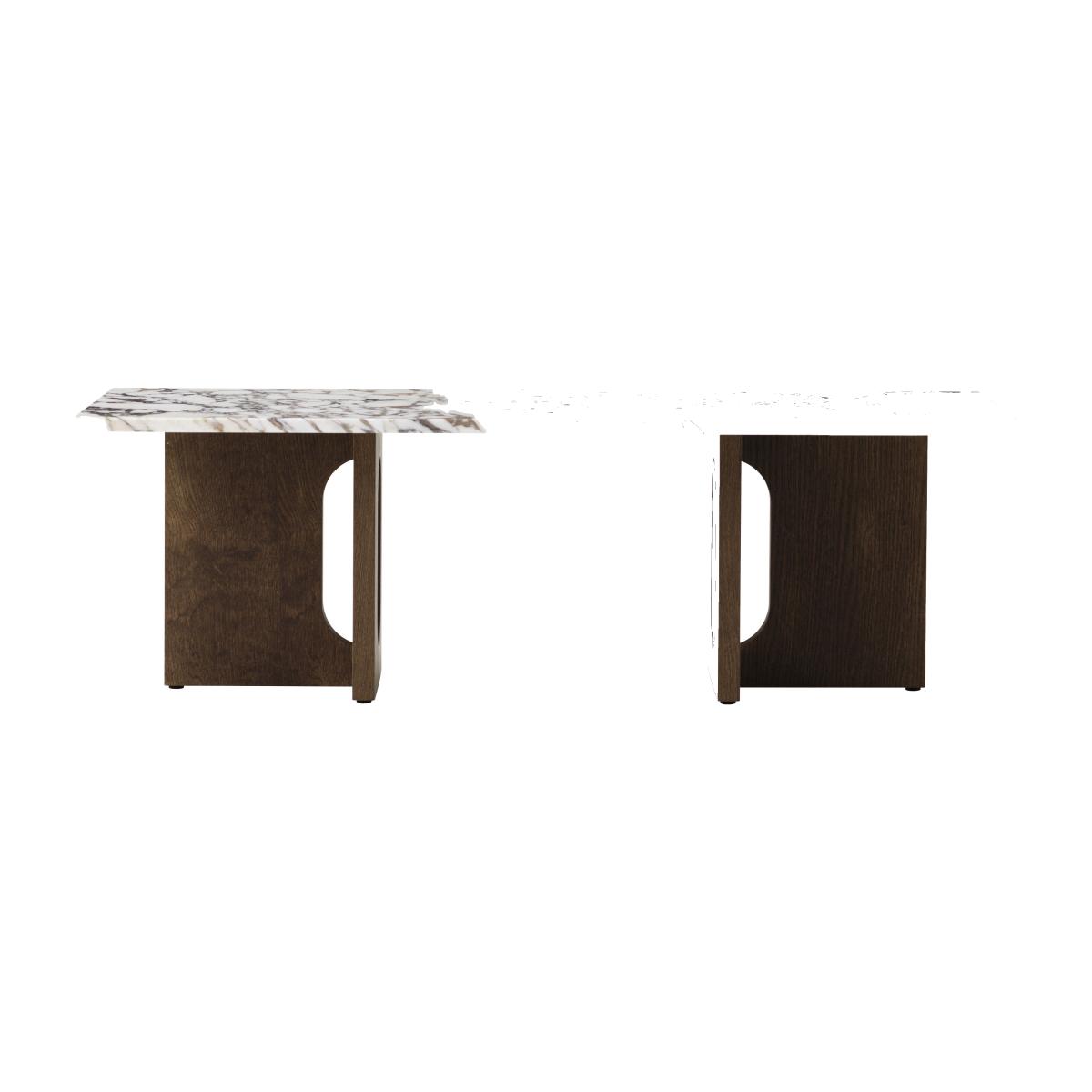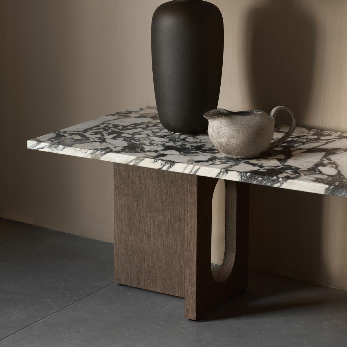 The Androgyne table is the creation of Norwegian architect and designer Danielle Siggerud. This table was originally designed to furnish the café space of the Menu showroom, which could be found in the "The Audio" hotel in Copenhagen. The Androgyne table collection presents simple silhouettes combined with elegant materials. Celebrating craftsmanship and wood, the Androgyne table is available with a walnut, stained oak or natural oak base and tabletops in wood, Kunis Breccia stone or Calcatta Viola marble. This table is also available in stones made entirely of stone or marble. The Kunis Breccia sand-coloured stone is a limestone which resembles marble and which stands out with its various tones of beige and brown, subtly intertwined. The classic and noble look of the materials combines wonderfully with the modern and graphic style of the base. This open structure is constituted of inter-crossed panels. The flat shapes and the central opening play with our perception of the volumes, offering an amusing interplay of perspective. This coffee table will go equally as well in very modern and more traditional interiors.