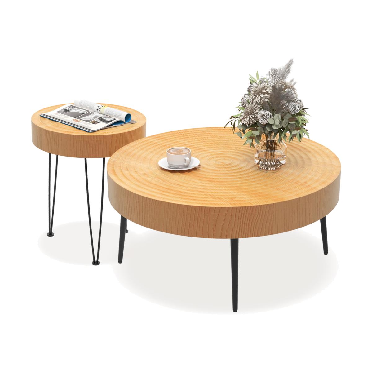 Wow! That's something! This round coffee table set features specially patterned tabletops that remind you of the natural ripples on a beautiful lake, as well as the growth rings of the wood. The novel and stylish appearance breathes a natural charm into modern living space and will go well with different decorations. Meanwhile, the durable material, the solid wood and rustproof metal material, makes a heavy-duty construction that can serve for long.