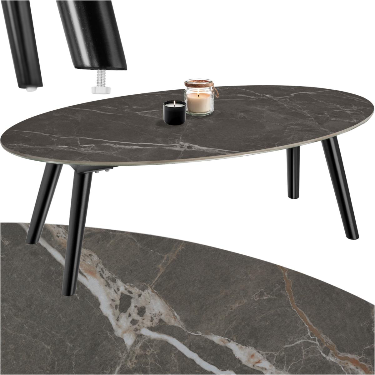 Discover the versatile oval shaped coffee table Acerra by tectake - an aesthetic interplay of timeless design and high functionality, and the ideal addition to your living room or patio. The round edged generous stone tabletop in an elegant marble look impresses not only with its sophisticated appearance but also with its high durability, offering ample space for storage of decorations, drinks or snacks. The low dining tables high load-bearing capacity is ensured by the solid wood legs, which are also equipped with height-adjustable and non-slip feet, providing a secure stand on any surface. Whether as a side table in the living room or in combination with chairs or other furniture in the garden this stylish piece of furniture impresses with its excellent quality and attractive appearance. Get the coffee table Acerra by tectake for your home now and enjoy the perfect combination of form and function.