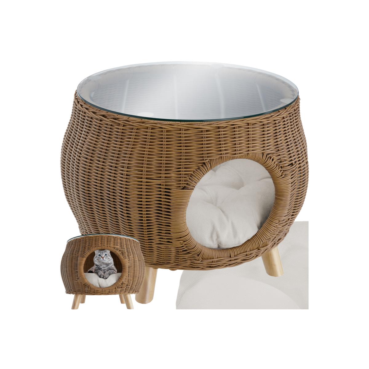 The coffee table Tivoli by tectake is an absolute must-have for all style-conscious pet owners. The wood side tables interior is lined with a super-thick, easy-care and washable polyester cushion the perfect snuggle paradise for cats or small dogs. The side table impresses with its elegant appearance thanks to the weave of round polyrattan. The tabletop made of extremely robust safety glass is reliably held by suction cups and offers sufficient storage space for drinks,snacks or a good book. The home furniture features large wooden legs and a solid aluminium frame which ensure high stability and load-bearing capacity and also make it weatherproof, ideal for outdoor use. Whether in the living room, dining room, on the terrace or in your reading corner the functional coffee table Tivoli will elevate your decor to a new level.