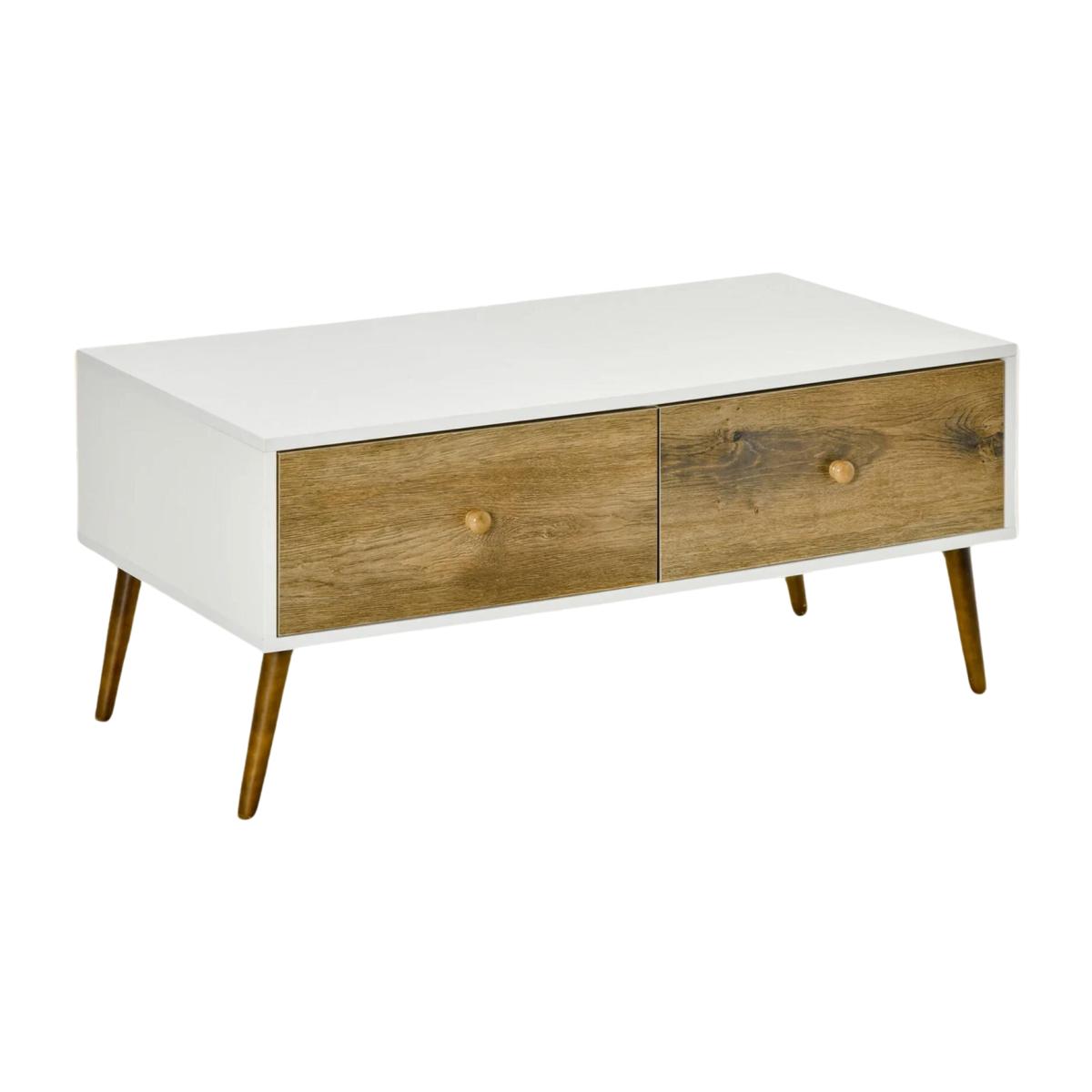 Seamlessly transition between using this coffee table as a side table or a storage cabinet, catering to your varied needs. Its divided storage compartments provide an organized solution for magazines, books, glassware, and more, ensuring your tabletop stays clutter-free. Effortlessly access your belongings with the easy pull-out mechanism and four generously sized drawers. These spacious compartments offer plenty of room to neatly store and organize your items, enhancing the tidiness of your living space. The combination of a sleek white top and natural wood drawer surfaces exudes timeless charm and sophistication. This classic design effortlessly complements a range of decor styles, adding a touch of grace to any room it graces. Crafted from Grade-P2 particle board and supported by sturdy beech wood legs, this coffee table boasts durability and stability. The smooth top surface and wood grain drawers are easy to maintain, ensuring lasting beauty with minimal effort. With overall dimensions of 45. H x 100W x 53.5Dcm and each drawer measuring 10. H x 42.7W x 25Dcm (interior dimension), this coffee table offers ample storage space. It has a weight capacity of 80kg, providing reliable support for your belongings and decor pieces.