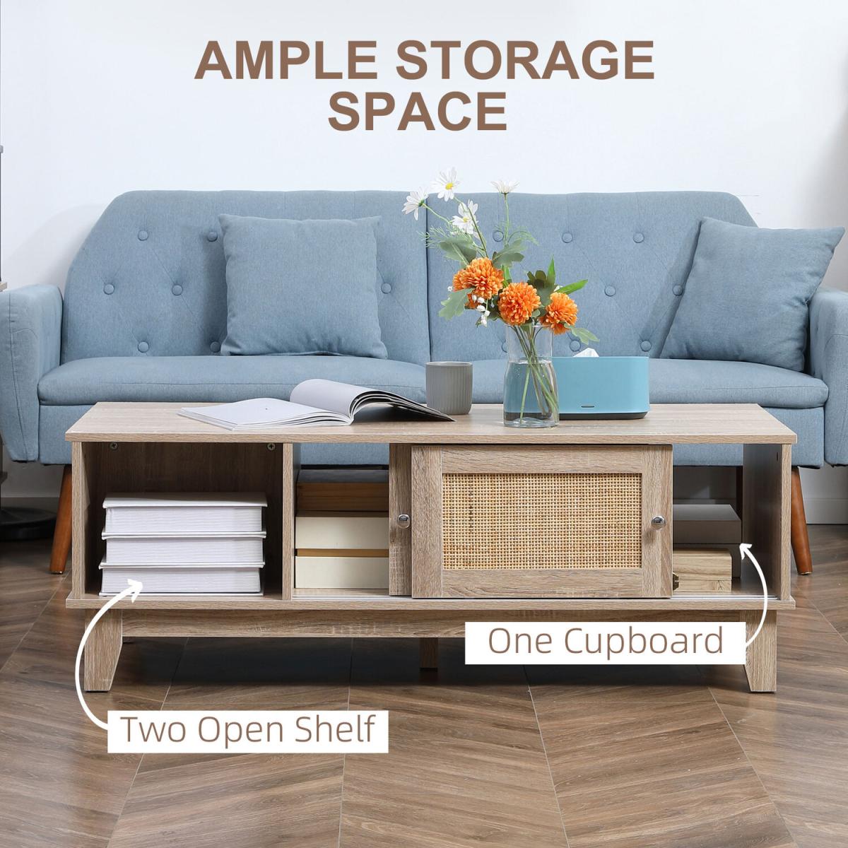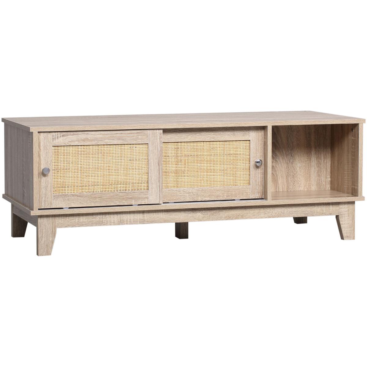 A natural look for a natural home look. This HOMCOM modern coffee table blends a wood-effect structure with front rattan panels - bringing the beauty of nature inside this season. The low design stands at the perfect level next to your sofa - you can place and grab items within easy reach. It features a double door storage compartment, with the sliding door allowing for easy access, alongside an open side shelf. Complete with metal handles on the doors.