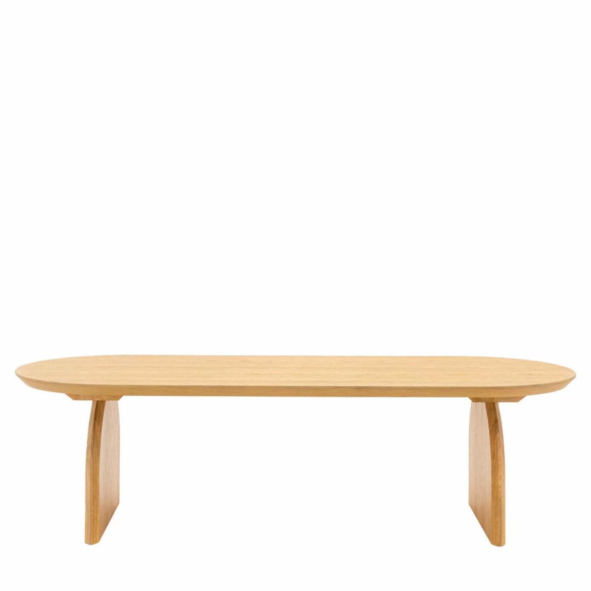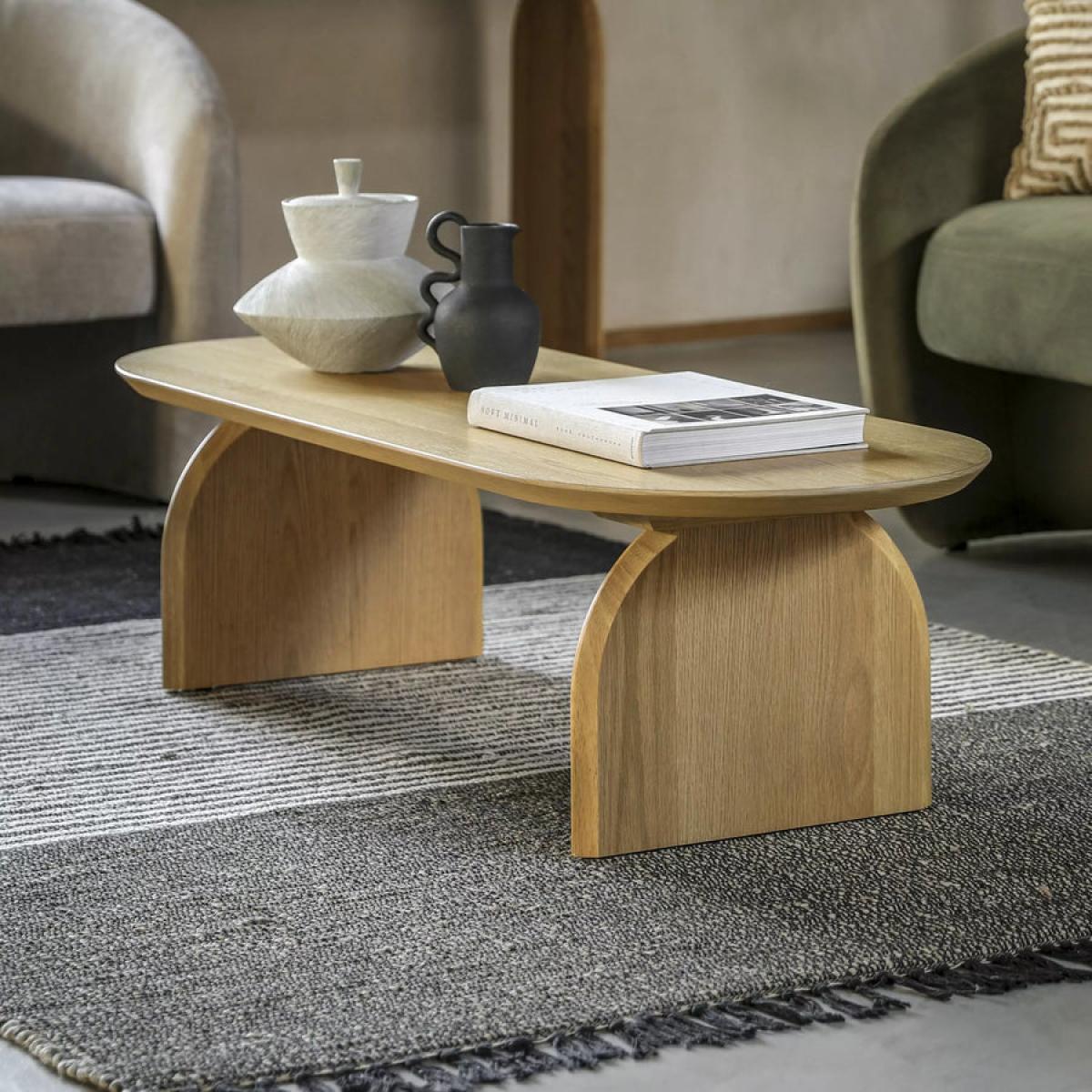With a nod towards retro style but in a more modern format, this stunning coffee table features a lovely elegant top with rounded ends, with this form echoed on the tops of the legs. It is made using oak veneers and solids, where practical, with a natural matt finish. Matching pieces available. Material: MDF 51% / Oak Veneer 45% / White Oak 4%. Colour/Finish: Natural.