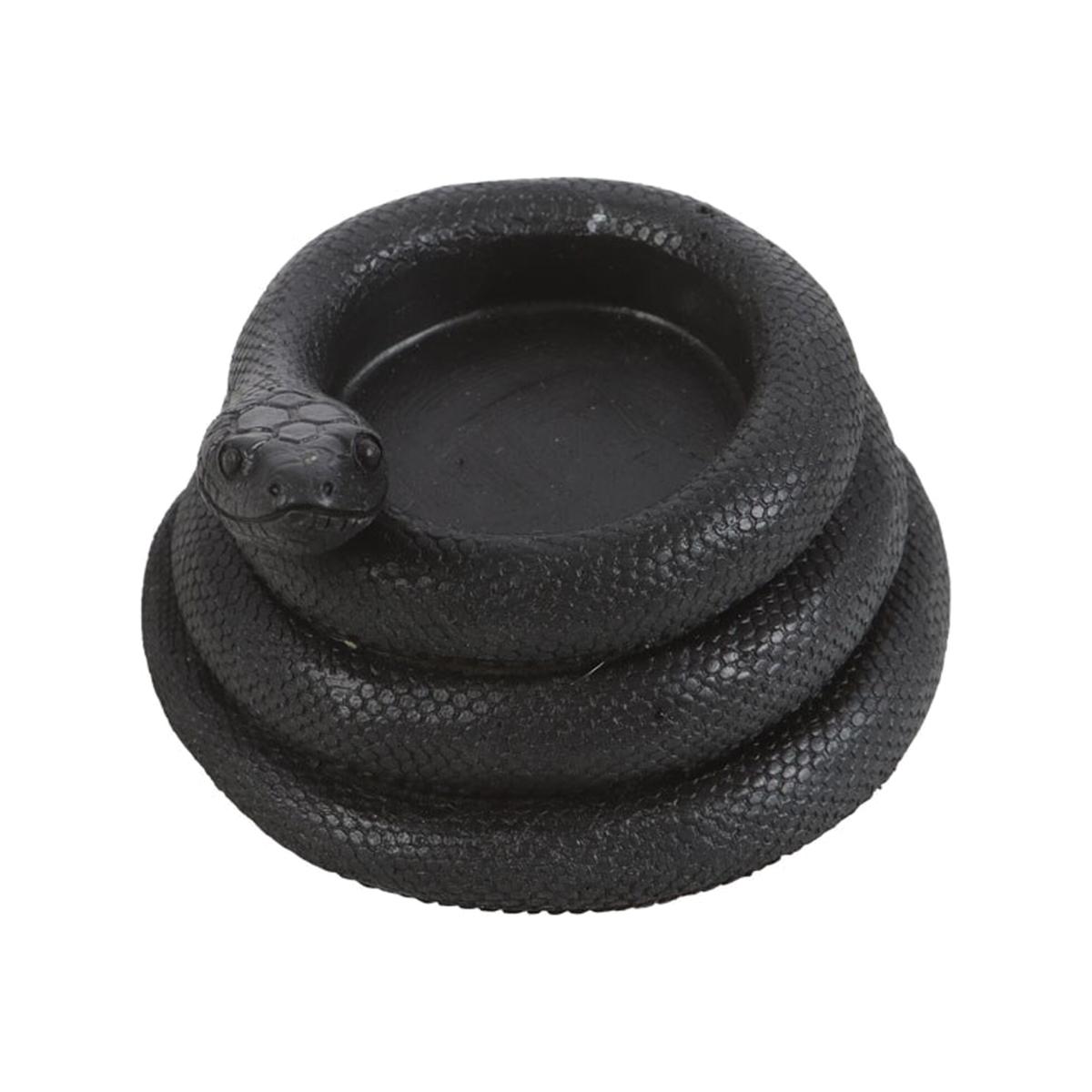 Perfect for adding intrigue and creepy vibes to your home decor. Made of resin, this sleek black tealight holder features a coiled snake design and accommodates a standard single tealight for casting captivating shadows and creating a mesmerizing ambiance. Ideal for enhancing both modern and eclectic interior spaces. Remember to never leave a burning candle unattended. Do not burn for longer than 30 minutes at a time and never allow the candle to burn all the way down to the base.