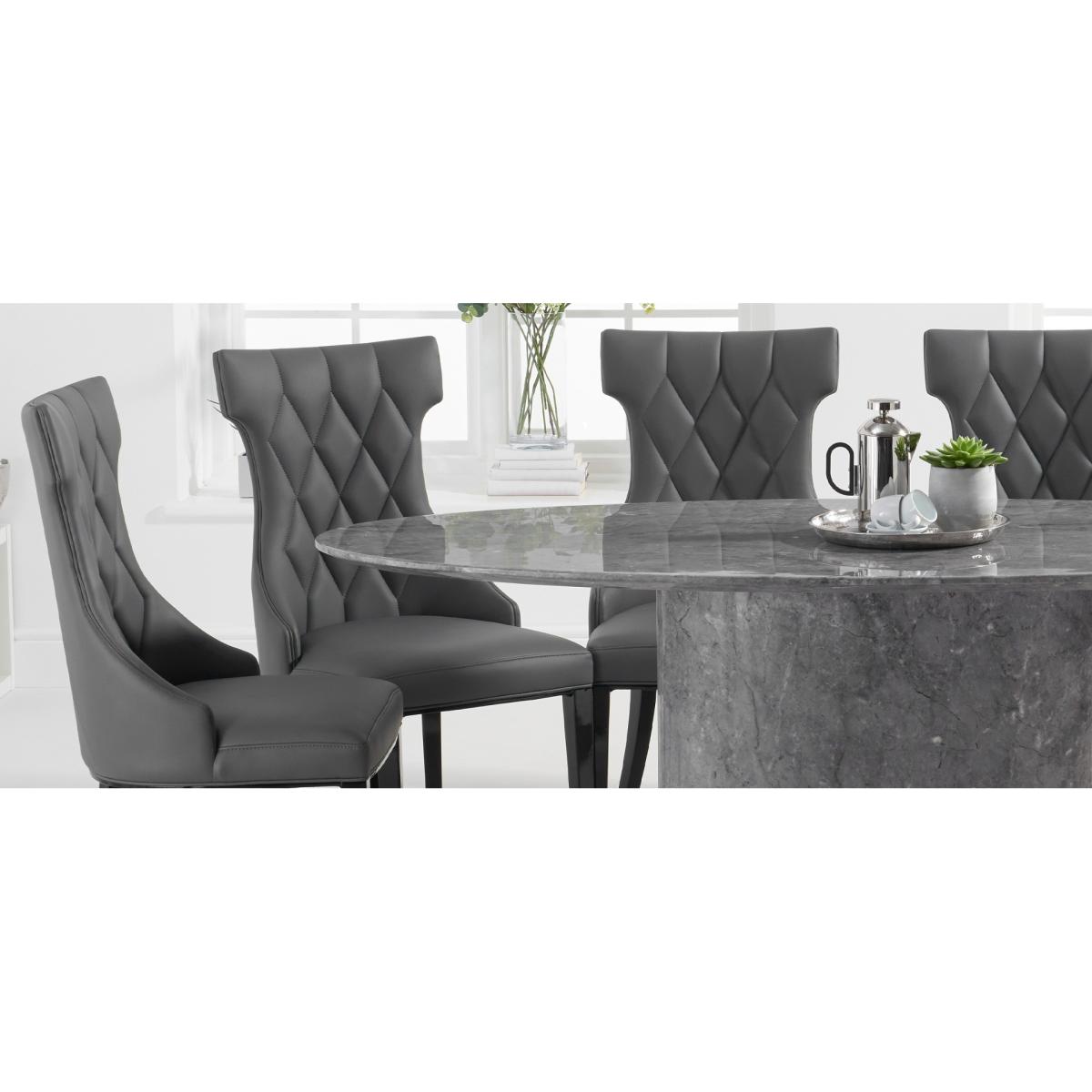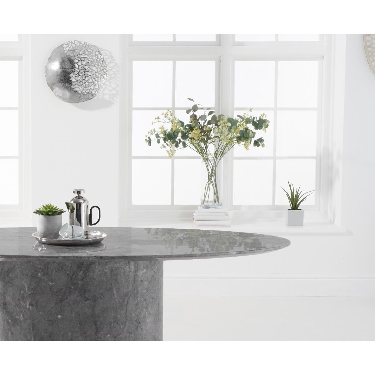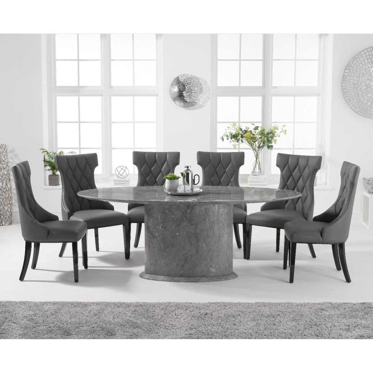 Large and spacious, the Colby 200cm Oval Grey Marble Dining Table with Freya Chairs is a luxurious dining set. The modern marble dining table features a generous oval shaped table top and wide pedestal and is matched with faux leather Freya chairs with diamond stitching. Large modern marble dining set Stylish and spacious; seats up to 10 people Ideal for families and entertaining Smooth grey marble table with generous oval shaped table top Wide, stable pedestal base for a bold contemporary look Wipe-clean high gloss finish Freya chairs complete the set Faux leather with striking diamond stitching High, supportive winged backrests High gloss solid wood legs