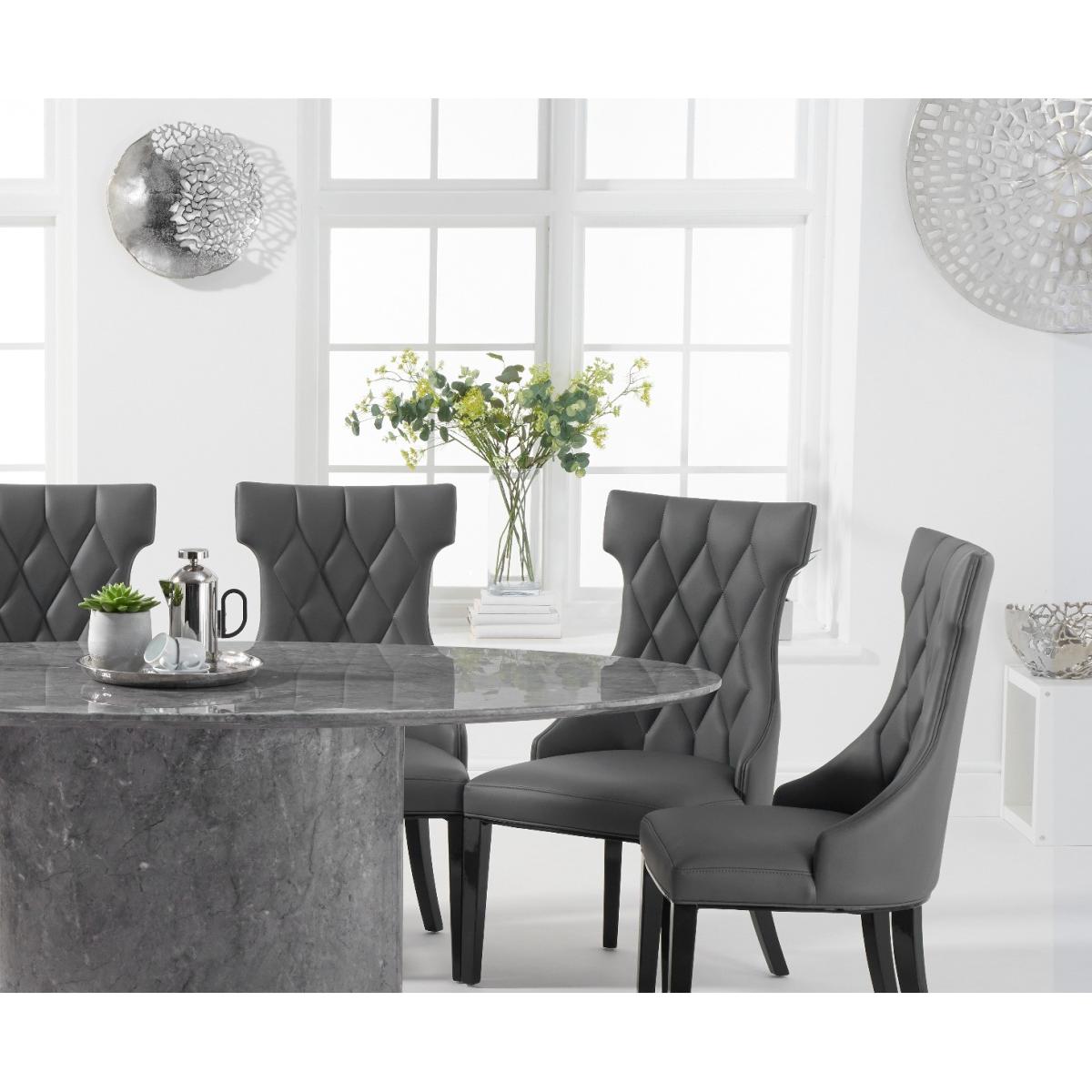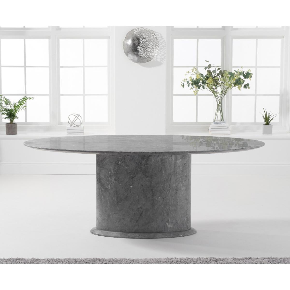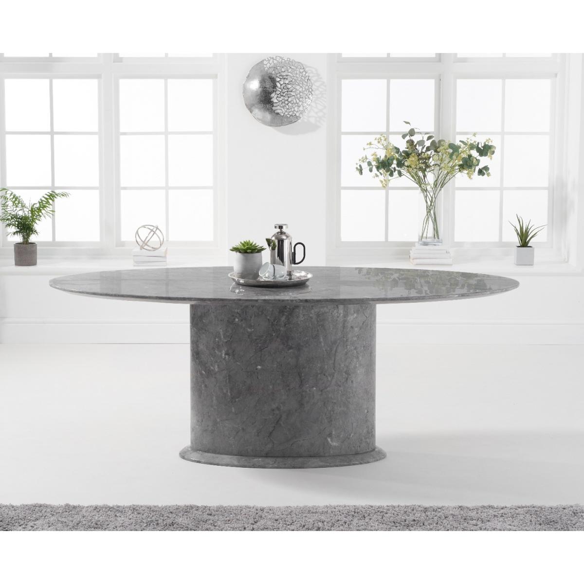 Large and spacious, the Colby 200cm Oval Grey Marble Dining Table with Freya Chairs is a luxurious dining set. The modern marble dining table features a generous oval shaped table top and wide pedestal and is matched with faux leather Freya chairs with diamond stitching. Large modern marble dining set Stylish and spacious; seats up to 10 people Ideal for families and entertaining Smooth grey marble table with generous oval shaped table top Wide, stable pedestal base for a bold contemporary look Wipe-clean high gloss finish Freya chairs complete the set Faux leather with striking diamond stitching High, supportive winged backrests High gloss solid wood legs