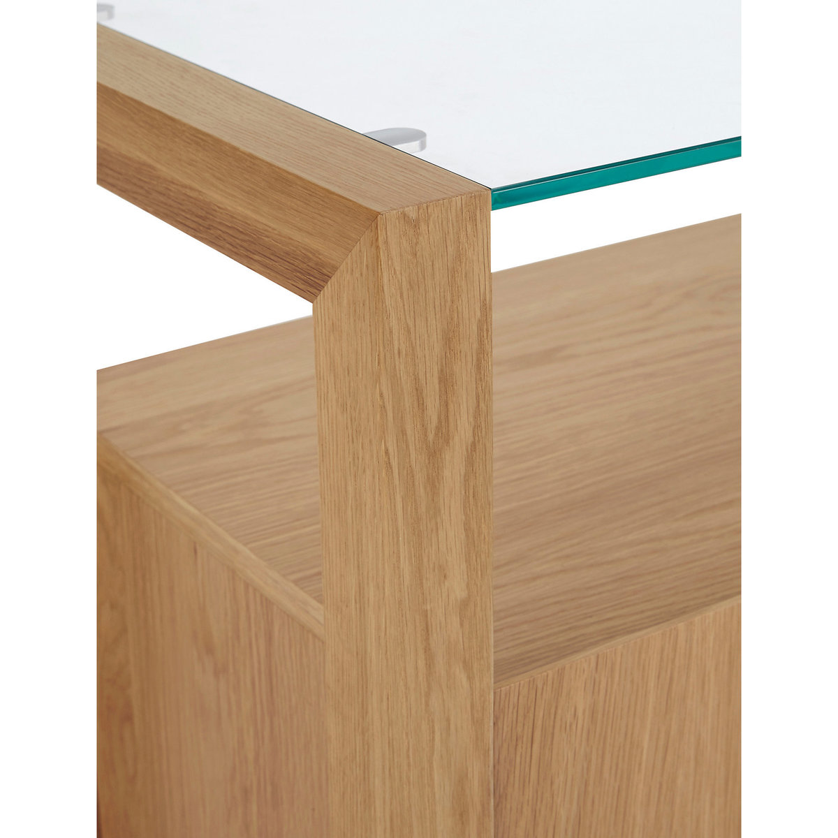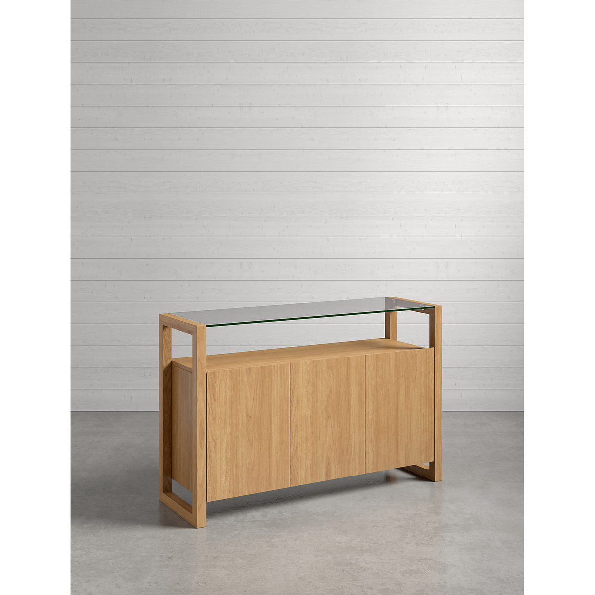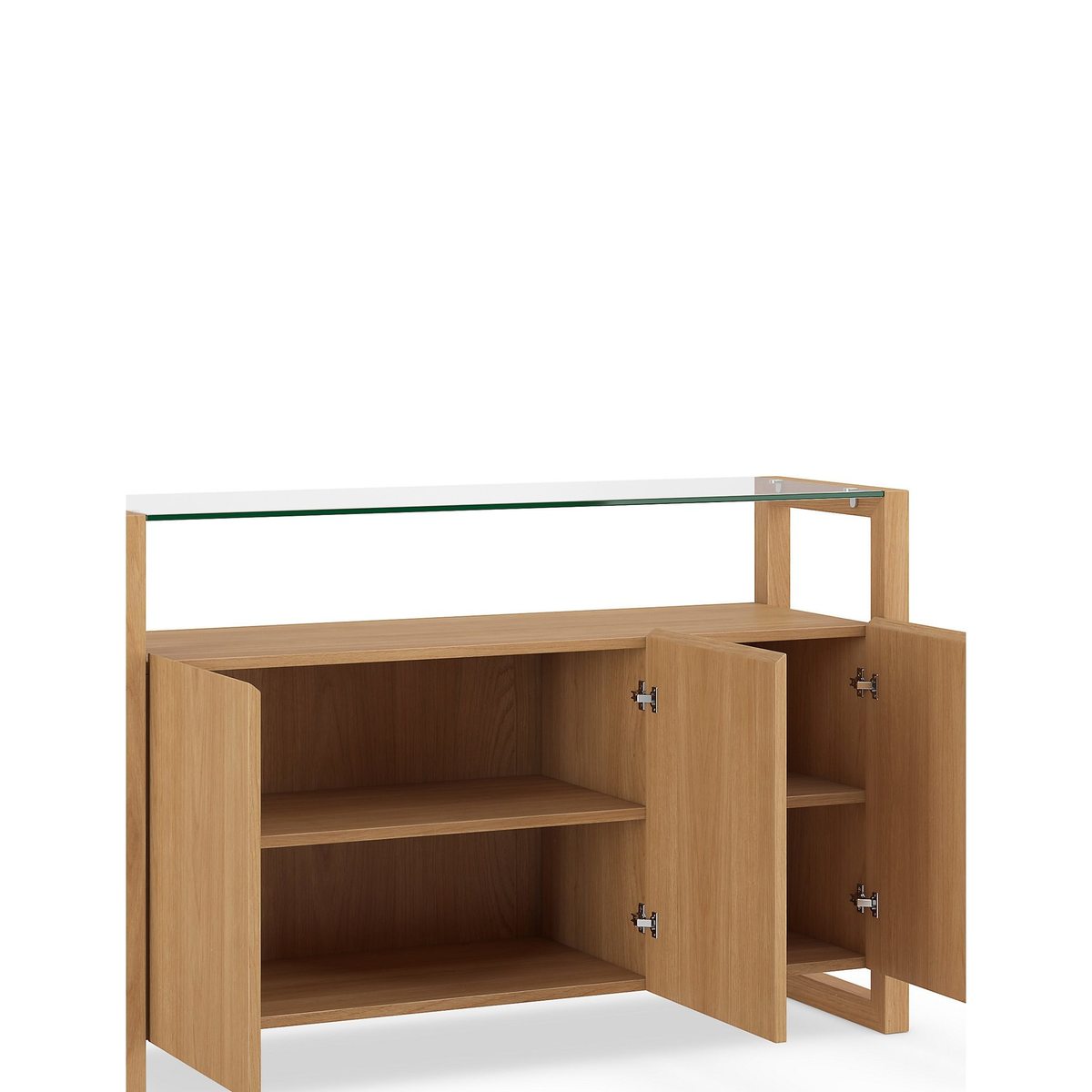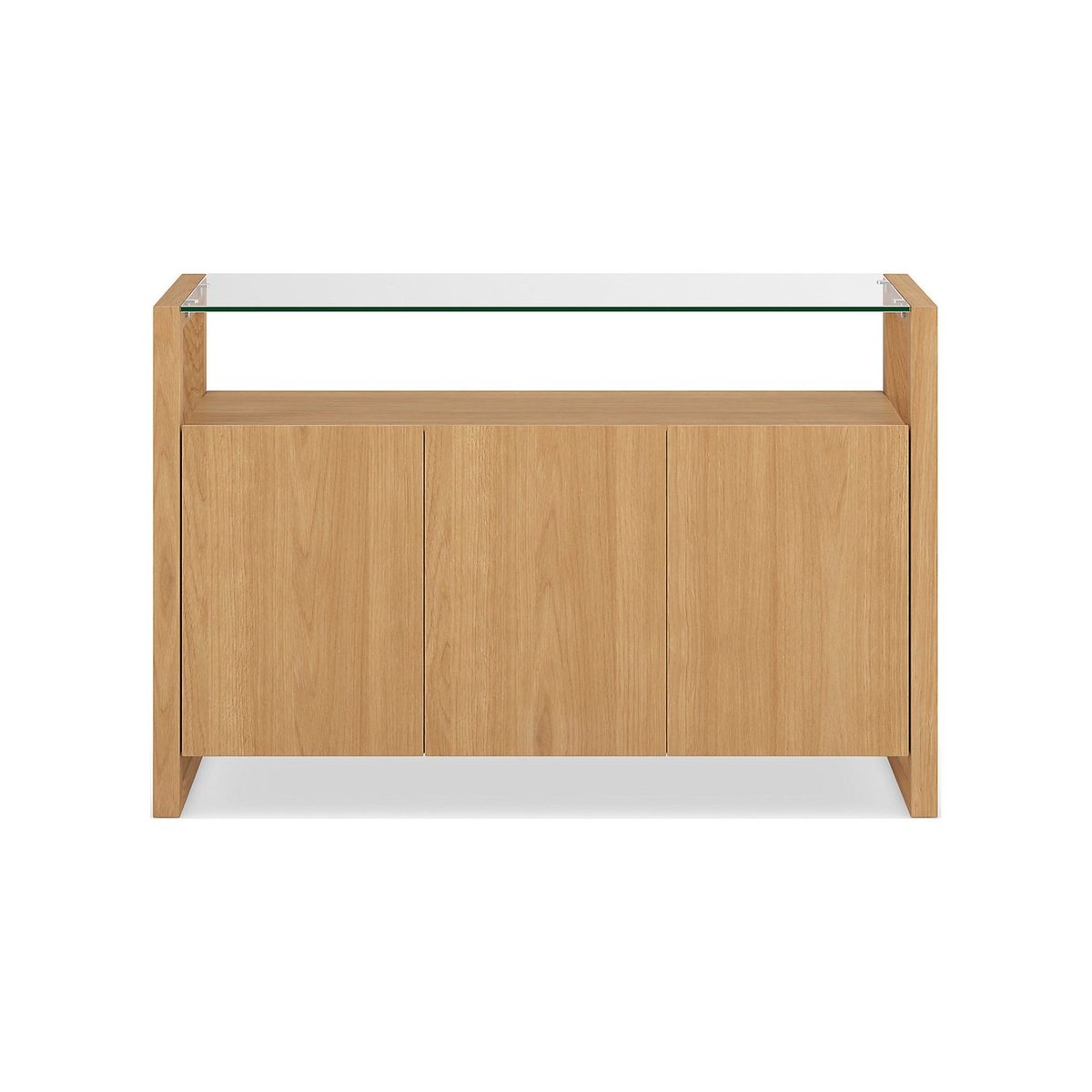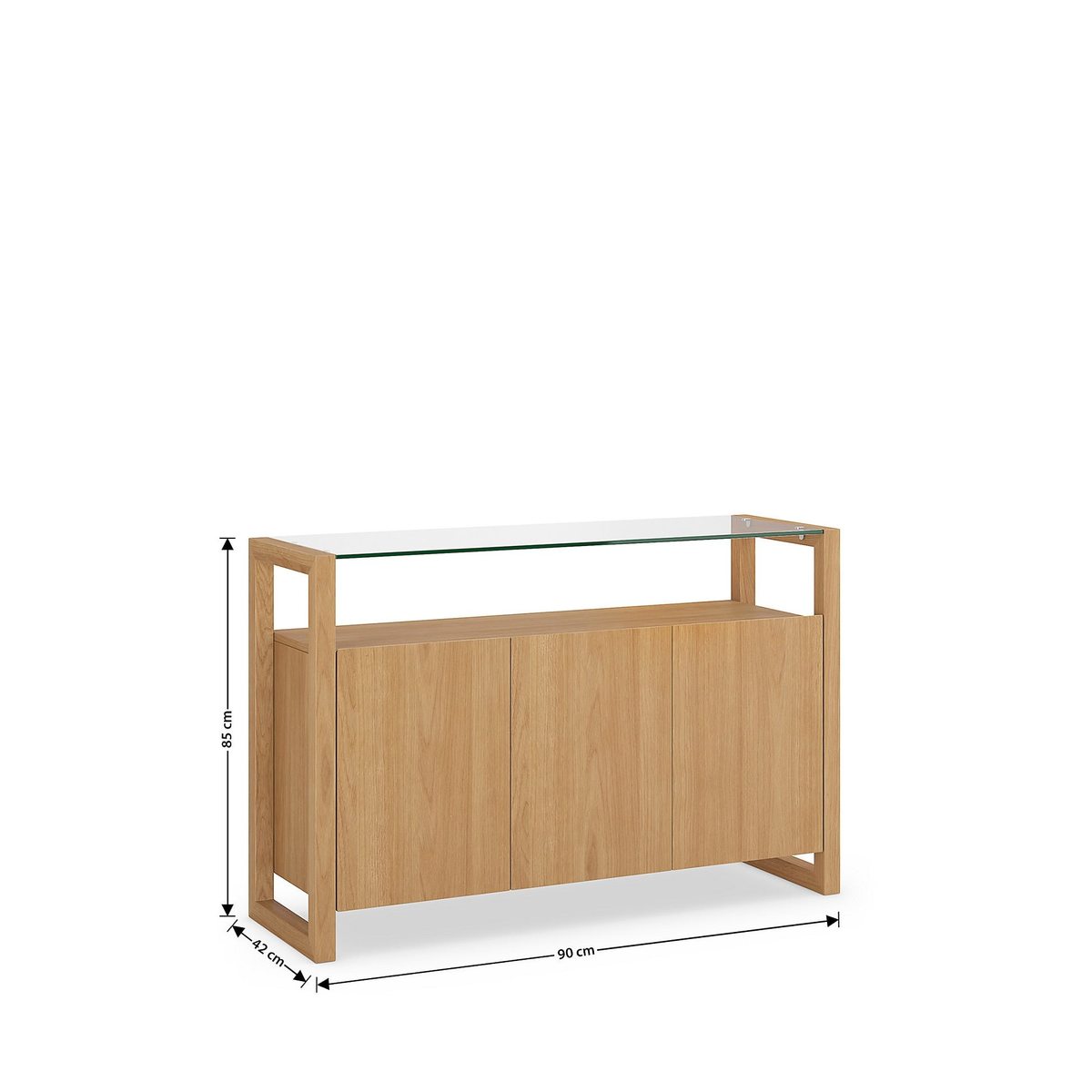 Make a bold statement with our sleek Colby sideboard that works as a great focal point in almost any room. This three-door sideboard provides ample storage space thanks to its shelf and cupboard space, perfect for hiding away remotes, blankets, towels, books and magazines behind soft-close doors. Designed with a sleek suspended glass top secure with stainless steel UV pads on top of a traditional wooden storage unit, it is the perfect contrast to suit the modern home.