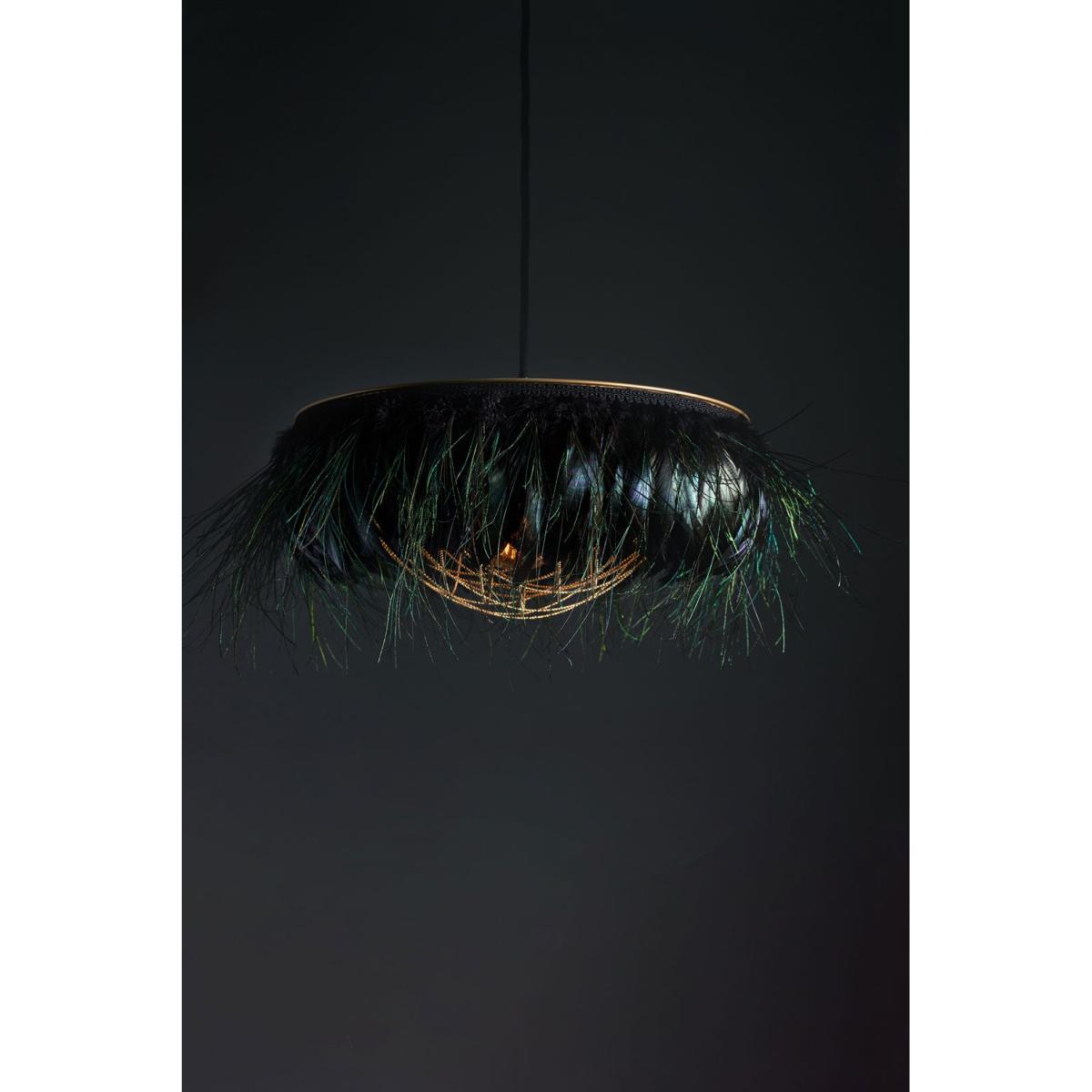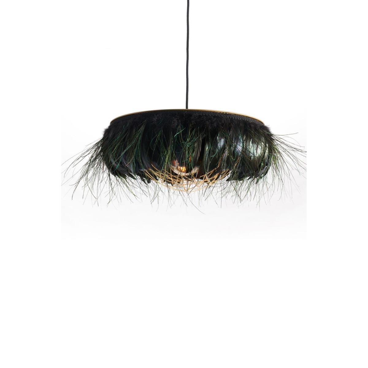 Bringing a delicate warm depth of colour and plush texture to your home, the Fabulous Feather Light Shade in Iridescent Black Peacock is a statement light shade that exudes extraordinary style and adds gorgeousness wherever you choose to hang it! This is a piece that dares to be different, and showcases elegant, ethically sourced, hand-dyed feathers and stunning brass ball chains. With a total diameter of 47cm, and a 15cm drop, the Juliette is very versatile. An easy-fit light shade that can easily be moved from one room to another, it's a real showstopper of a design. If you're looking for a talking point for your home, look no further! Please note: The frame without feathers is exactly 42cm. The extra margin of 5cm is representative of the typical flare of the feathers.