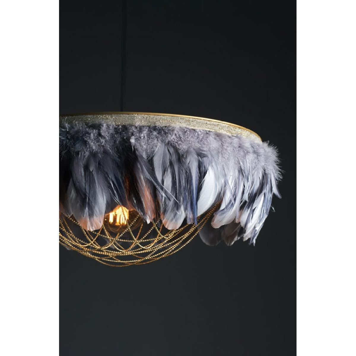 About The Juliette Feather Shade - Two Tone Grey Bringing a gloriously tranquil colour and a sumptuously soft texture to your existing decor, the Fabulous Feather Light Shade Featuring Chains in Two Tone Grey is a chic light shade fitting that exudes effortless style. Handmade and designed by Coldharbour Lights this glamorous Feather Pendant Light is ultra exuberant, showcasing elegant, ethically sourced, hand-dyed feathers and gorgeous brass ball chains. A fabulous statement light design that is both daring and delightful. The Fabulous Feather Light Shade measures 20cm in height with a diameter of 50cm. Why We Think You’ll Love The Grey Feather Light Shade A Chandelier Ceiling Light Shade that creates the wow factor in any room, this feather-light is a magnificent nod to the opulent art deco era with its show-stopping gold accents and sophisticated use of plush goose feathers. Providing your home with an outstanding feature that is oozing with extraordinary charm, this Ice Grey Pendant Chandelier Light Shade mixes functionality with dazzling design, bringing an unapologetically opulent look to your space instantly. Where To Style The Vintage-Style Chandelier Light Shade Use this Art Deco Chandelier as a Hallway Light Shade to inject a neutral yet divine colourway into the space that can be paired with any interior, creating a flawless feel from the moment you walk into your home. The Grey Feather Light Shade will look serenely stunning in your living area adding a wonderful texture, pair it with the Round Brass and Marble Drinks Trolley for a twenties scheme that is oh-so playful in style. Please note, this light shade is handmade by Coldharbour Lights, a British based small business and, as such, the delivery time for this product will take a little longer to arrive. As with all hand-made products this light shade may have slight variations in style. We believe this only enhances its uniqueness and beauty!