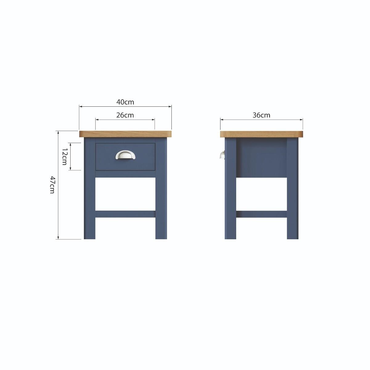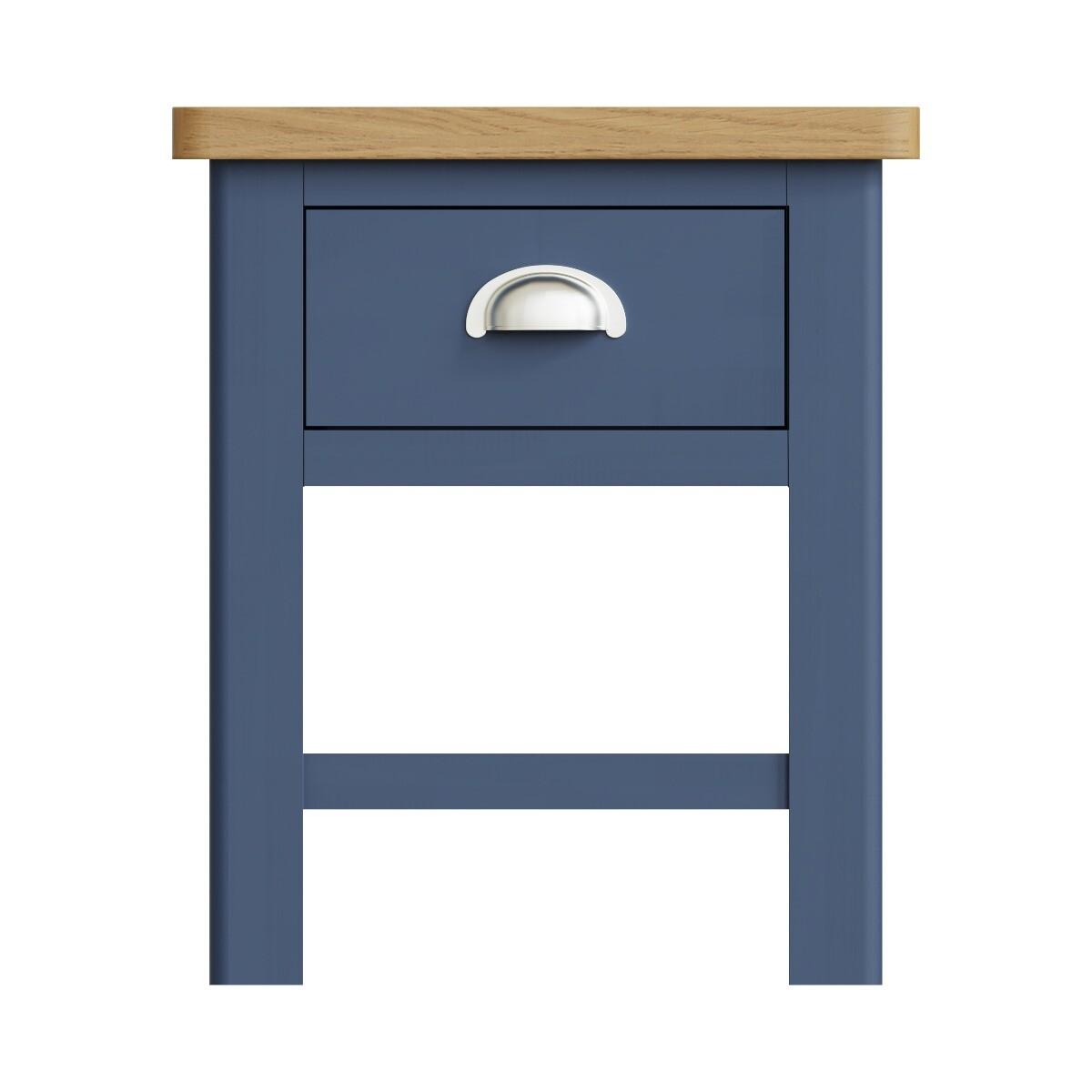 The Cole Oak and Blue lamp table was designed and built to satisfy your need for quality and durability without compromising on style. It has an elegant, compact frame with a stylish two-toned design, and will introduce character and warmth to any space. Unique and stylish lamp table for your hallway. A sturdy, solid wood frame that guarantees quality and durability. Dense solid oak top with smooth, rounded corners and a warm, radiant light oak finish. Smooth Blue painted finish on the frame. The table’s height is 47 cm. 1 handy drawer running on wooden guides. This drawer has a stylish antique cup handle with a brushed chrome finish. Low 11 cm shelf for extra storage. Comes ready assembled. Look out for other items from this collection.
