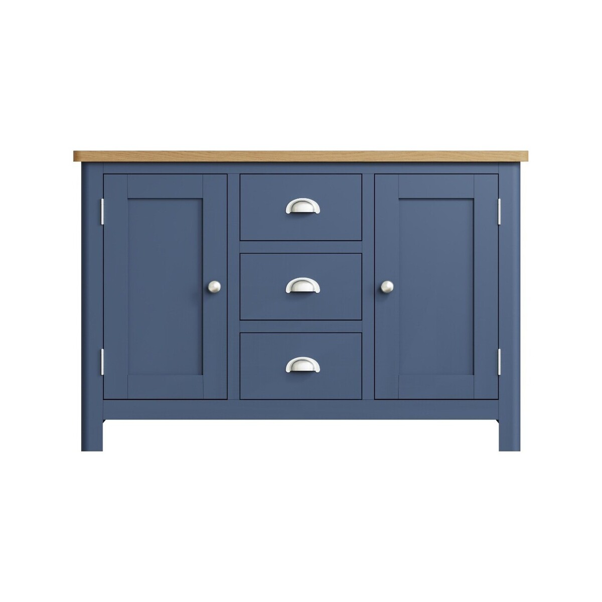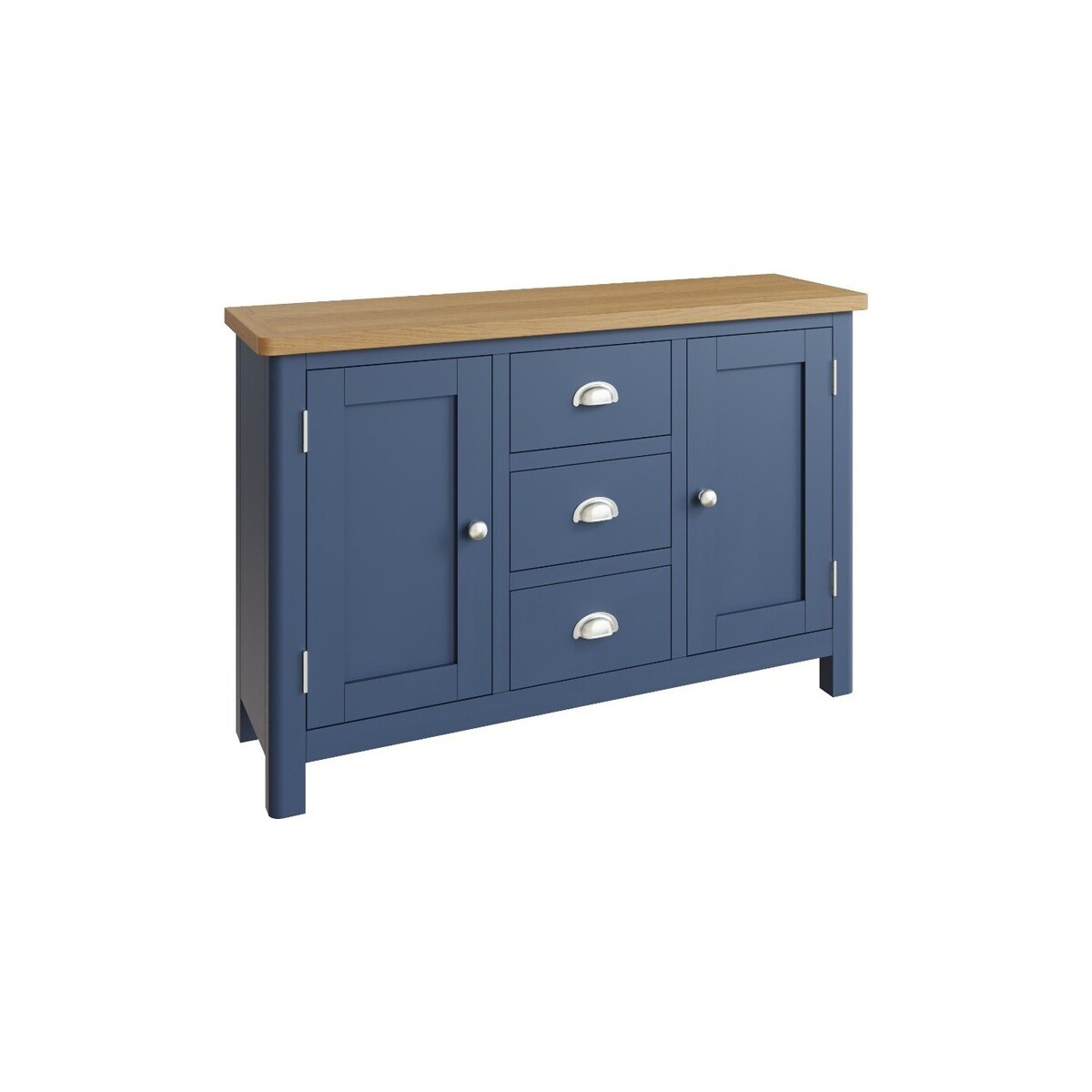 Stylish, functional and durable, the large Cole Oak and Blue sideboard will satisfy your dining room storage needs. This storage features a solid wood frame with a stunning blue painted finish and radiant rustic oak top. The spacious sideboard offers plenty of storage for your dining room essentials and features 3 dovetailed drawers running on wooden guides, with sleek chrome effect handles. A stylish storage option for your dining room. Assembled using oak, pine, MDF wood and oak veneer, with a sturdy solid wood frame. Classic two-tone design. Chunky solid oak top with a rustic light oak finish and smooth rounded edges. Short, sturdy solid wood legs that provide firm stability and support. Striking dove blue finish.2 wooden cabinet doors with antique chrome effect knob handles.3 dovetailed drawers with sleek cup handles. Cabinet storage space. Clean internal finish. A model with an oak and dove grey finish also available.3-door, 2-door and small sideboard also available.