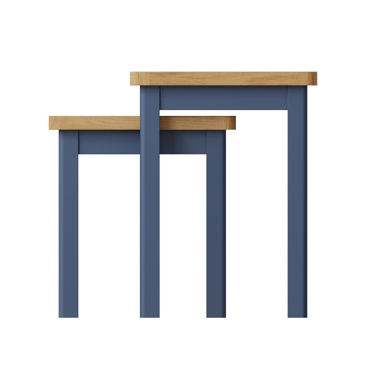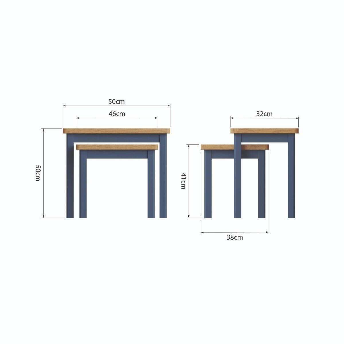 The Cole Oak and Blue nest of 2 tables is an elegant furniture set that was designed and built with quality, style, and durability in mind. These tables have a stylish, two-toned design that will add to the aesthetics of your living room. Sturdy and stylish nest of 2 tables for your dining room. A strong, solid wood frame that guarantees quality and durability. They stack together neatly, making it easy and convenient to store them away when they’re not in use. Dense, solid oak table tops with smooth, rounded corners and a warm, light oak finish. Light Blue painted finish. Strong, solid wood legs that provide maximum stability and support. Comes ready assembled. Look out for more items from this collection.