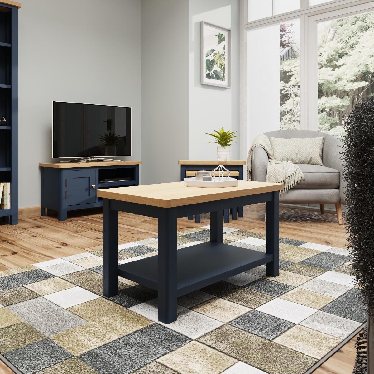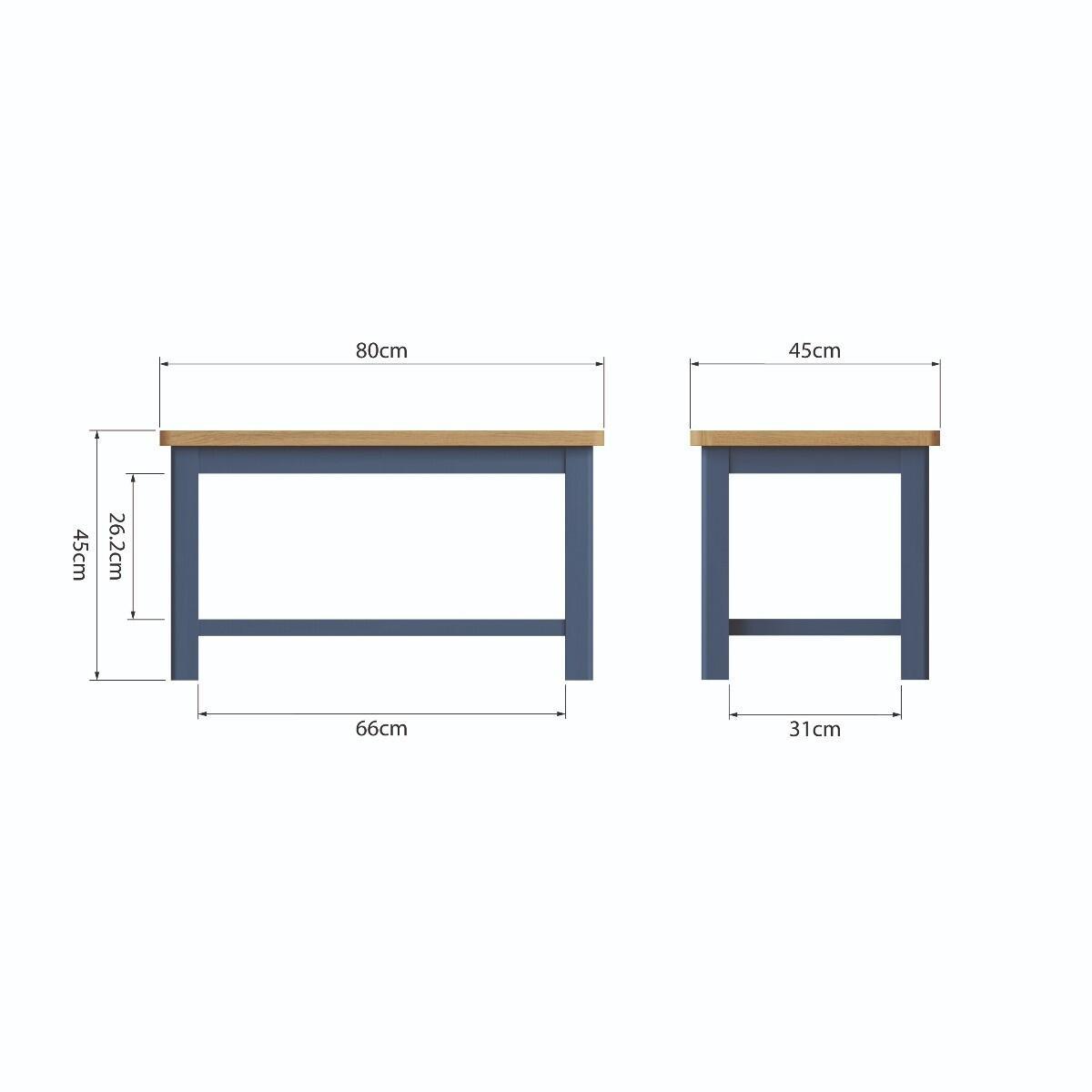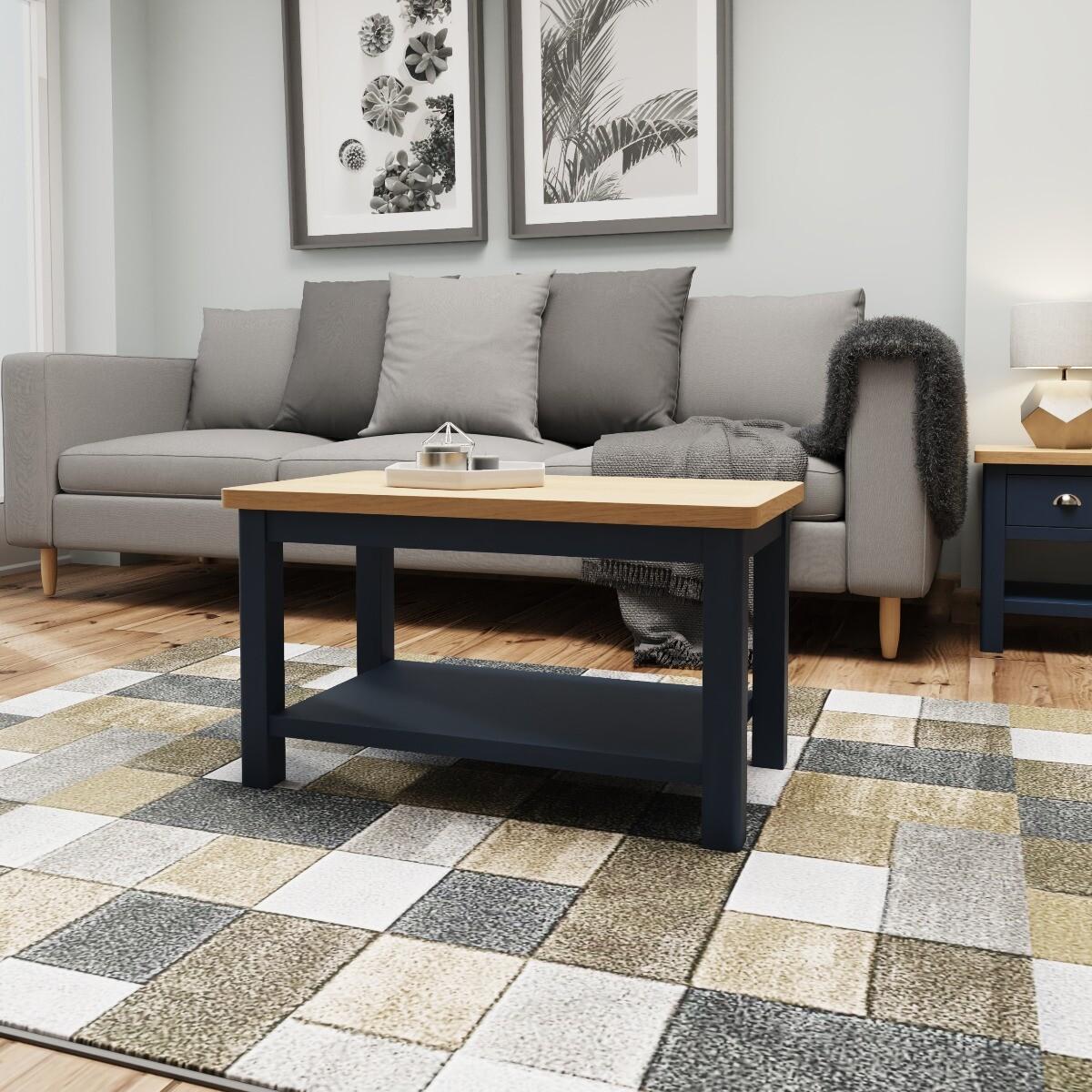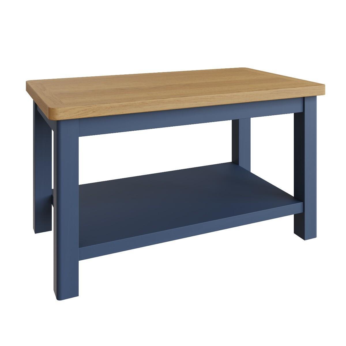 The Cole Oak and Blue small coffee table is an elegant piece of furniture designed with quality, style, and durability in mind. It was crafted from oak, oak veneer, pine, and MDF wood and has a sturdy, enduring frame. This coffee table has a stylish two-toned design that will make an impression in your living room. A small and compact coffee table that helps conserve floor space. Has a strong, solid wood frame and is bound to last through generations of use. Dense, solid oak tabletops with a radiant, light oak finish and smooth, rounded corners. Blue painted finish on the frame. Sturdy, solid oak legs that guarantee stability and support. The coffee table is 45 cm high. Low 11 cm magazine shelf for extra storage. Comes ready assembled. Look out for more items from this collection.