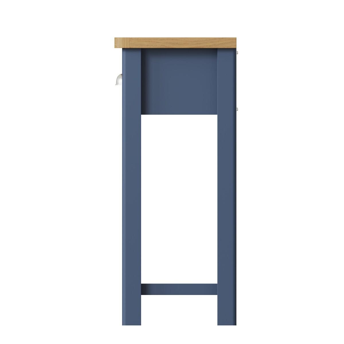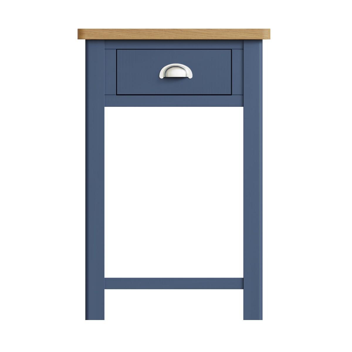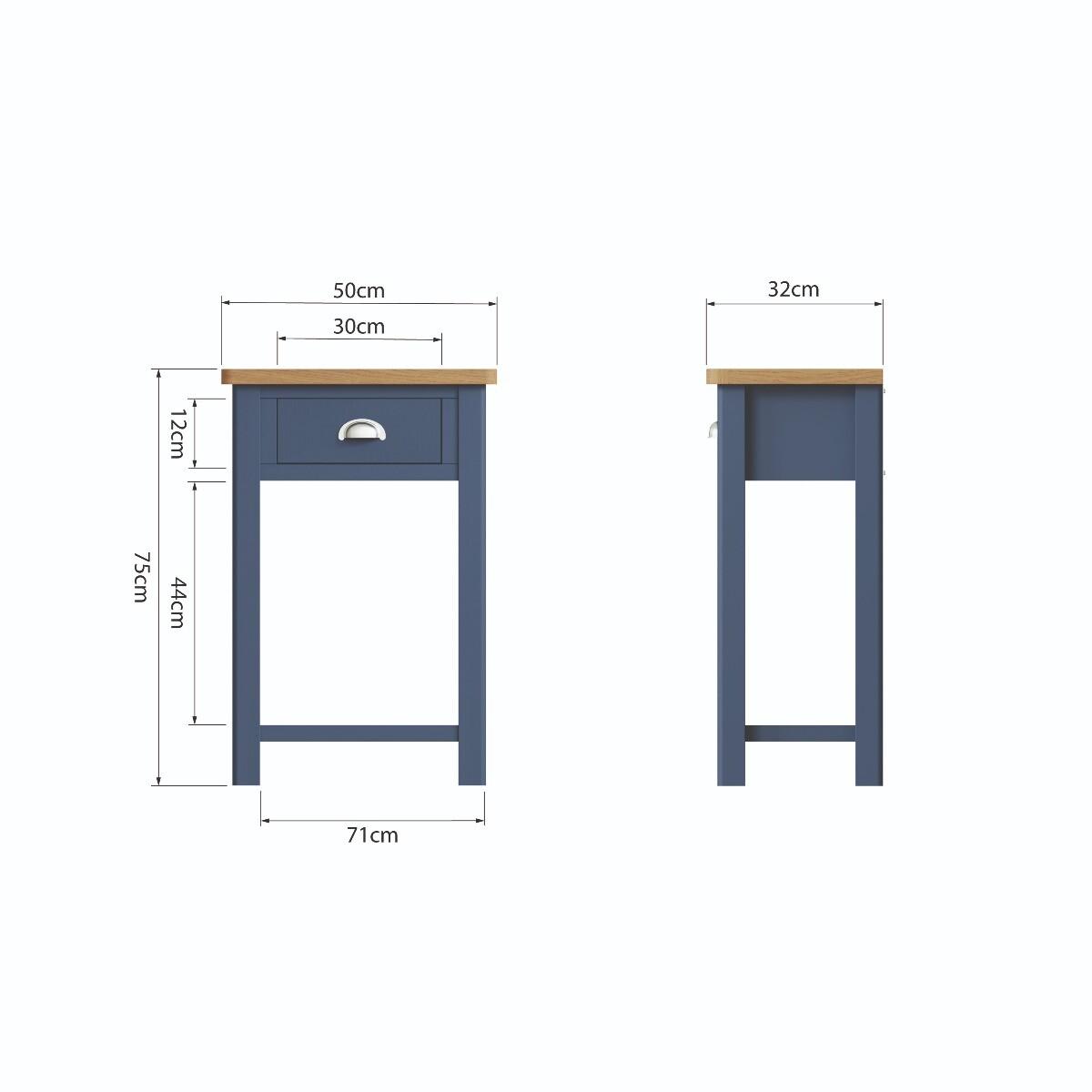 Versatile and stylish, the Cole Oak and Blue Telephone Table is a stunning addition to any home. Crafted from durable solid wood, the Telephone Table features a grey painted finish contrasting with a natural oak top and is complete with an upper drawer and lower shelf. Chic and sturdy Telephone Table Durable solid wood frame Blue painted finish contrasting with oak top for a classic look Handy upper drawer on wooden guides with brushed chrome effect handle Lower shelf for additional storage Fully assembled Complete the look with matching items from the Cole Oak and Blue Collection