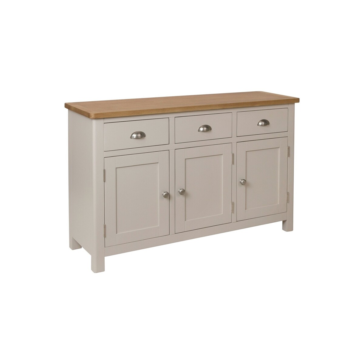 The Cole Oak and Truffle Grey 3 door sideboard is a stylish storage unit was designed and built with quality, durability and practical use in mind. This sideboard has a stylish, two-toned design that gives it a bold, impressive look and adds to the existing decor in the room. It provides enough space to accommodate your storage needs and will be a useful and valuable addition to your home. A stylish and spacious storage unit to satisfy your storage needs. Has a sturdy, solid wood frame and is bound to last through generations of use. Double and single cabinet, both with internal shelves.3 cabinet doors with antique, brushed chrome knob handles. Dense, solid wood top with smooth, rounded corners and alight oak finish that brings out the grain in the wood. Stylish, painted truffle grey/greige finish on the sideboard’s body frame. Strong solid wood legs that provide maximum quality and support. Comes ready assembled. Look out for more items from this collection.