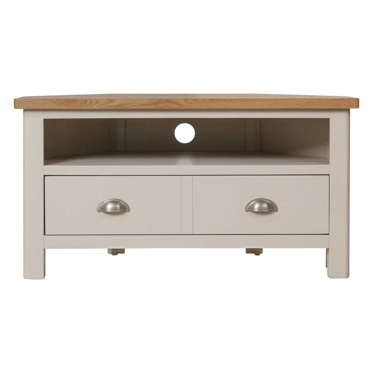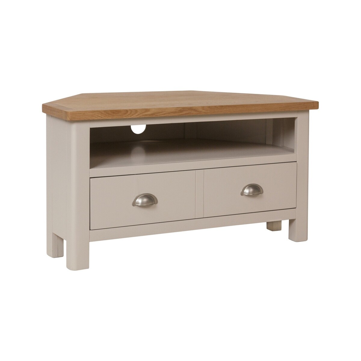 The Cole Oak and Truffle Grey corner TV unit was designed and built with quality, style and useful function in mind. This TV stand was crafted from oak, oak veneer, pine, and MDF wood, and has a sturdy truffle grey painted solid wood frame. It features a stylish two-toned finish and a unique, angular design that makes it easy to tuck it neatly into a corner, which helps conserve floor space. A stylish and unique corner TV unit. Strong, enduring frame. Radiant solid oak top with a warm finish and smooth, rounded corners. Light truffle grey/greige paintedfinish. Open shelf for your media players.2 handy storage drawers on wooden guides. Cable holes in the back for easier wiring and cable management. Sturdy, solid wood legs that offer maximum stability and support. Comes ready assembled. Look out for more items from this range of furniture.