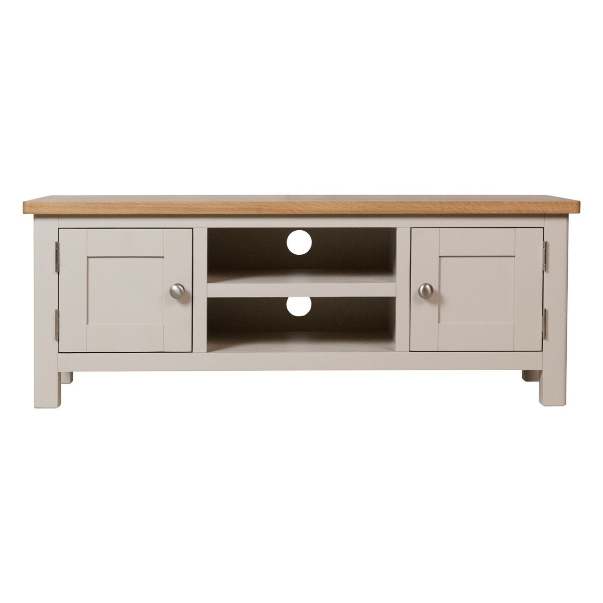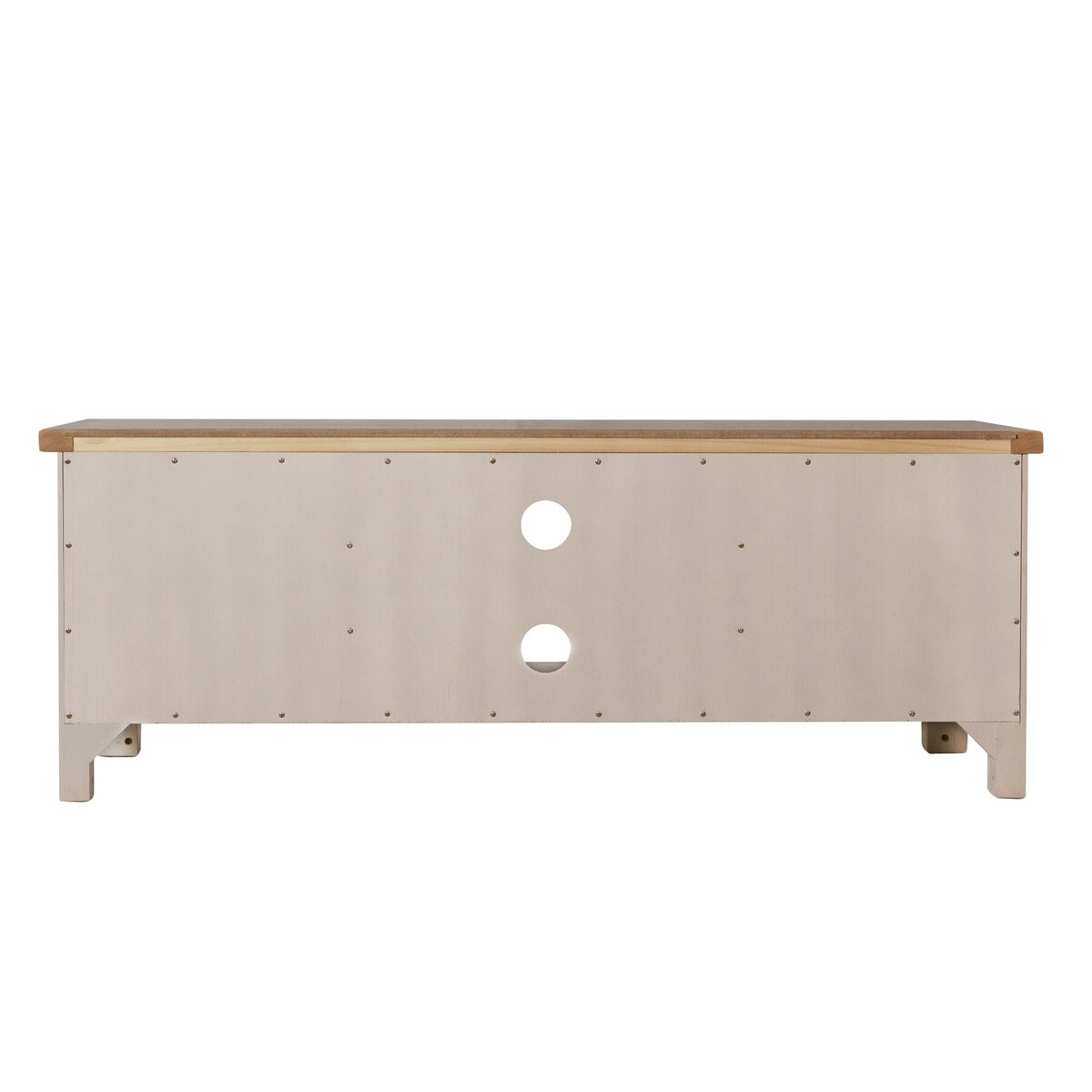 The Cole Oak and Truffle Grey large TV unit is a stylish and elegant addition to any space. This TV stand is large and spacious, therefore offers more than enough space for your TV, consoles, and media players. Thanks to its clean, two-toned design, this TV Unit will make a stunning impression. Large and spacious television stand, designed to fit TVs as wide as 60”. Strong solid wood frame with light truffle grey/greige painted finish. Dense solid wood top with smooth rounded corners and a radiant, light oak finish.2 open shelves for media players. Cable holes in the back of the TV stand for easier wiring and cable arrangement. Comes ready assembled. Look out for more items from this furniture collection.