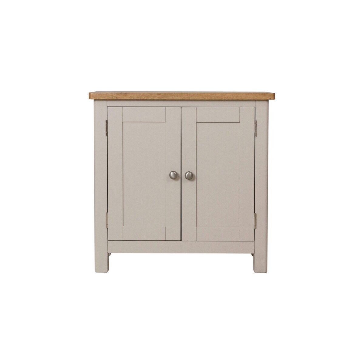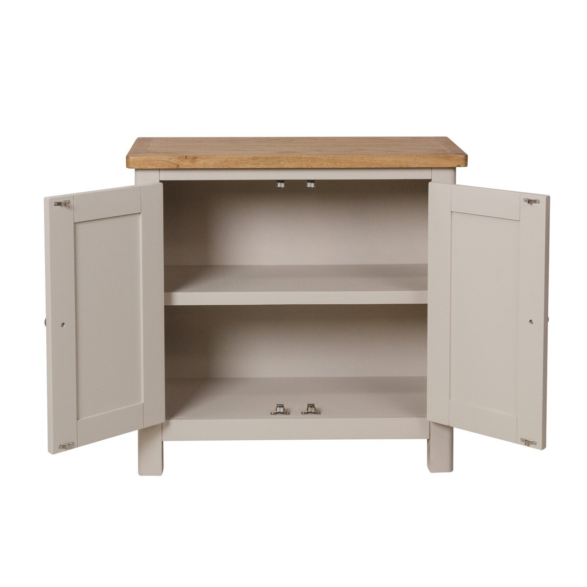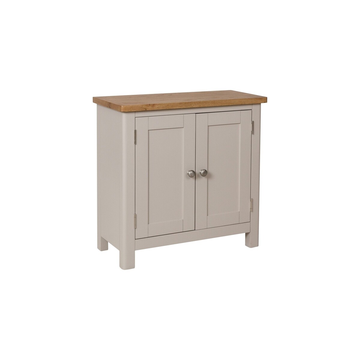 Designed to complement any home, the Cole Oak and Truffle Grey Small Sideboard is stylish and practical. Crafted from durable solid wood with a truffle grey painted finish, the small sideboard features an oak top with rounded corners and offers plenty of storage with a double cabinet with a shelf. Small and sturdy oak and grey sideboard Strong solid wood construction Truffle grey/greige painted frame with oak top and rounded corners for classic style. Double cabinet with shelf offers plenty of storage. Brushed chrome effect knobs complete the look. Fully assembled. Matching items available from the Cole Oak and Truffle Grey Collection