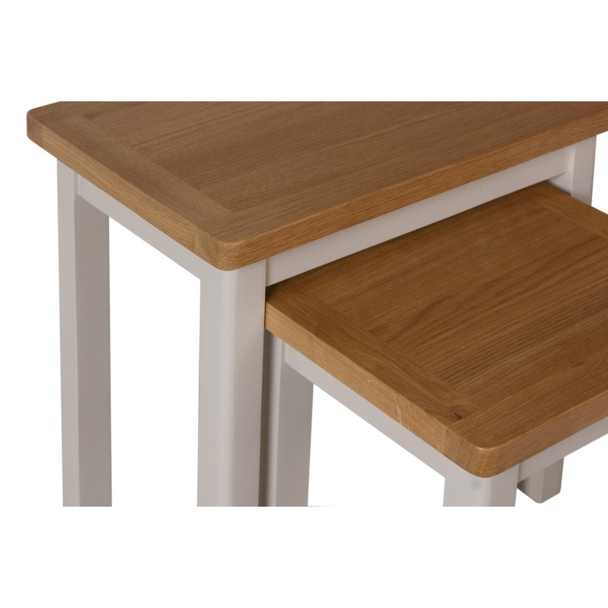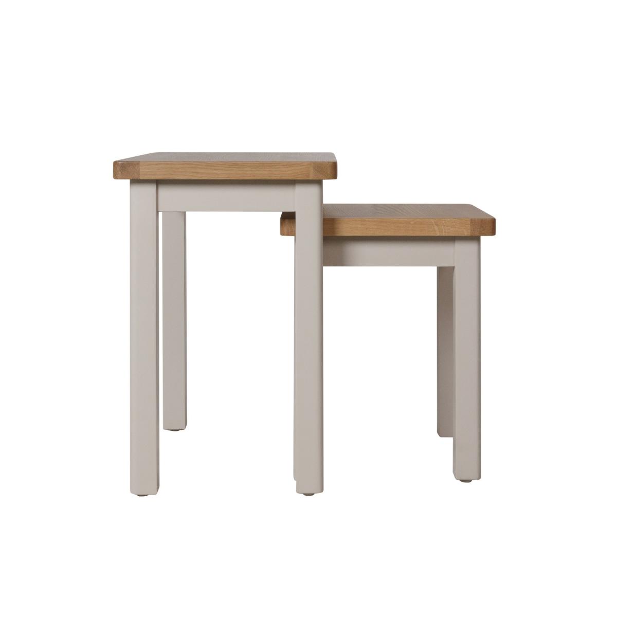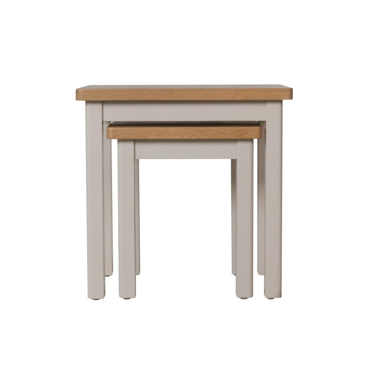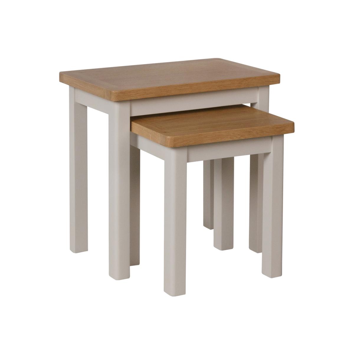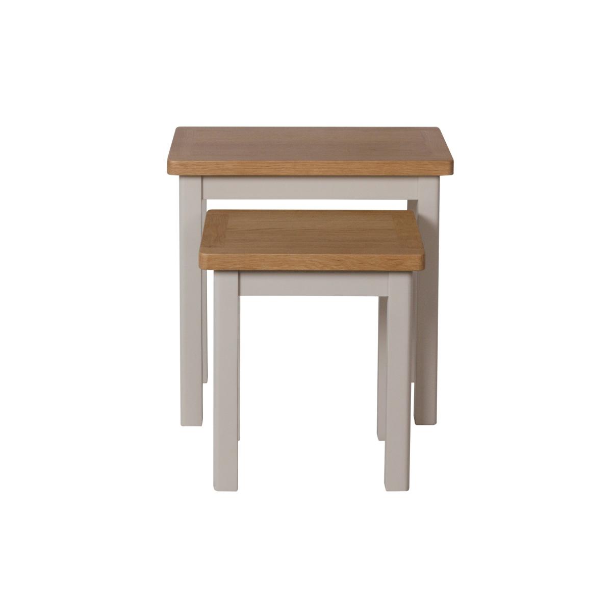 The Cole Oak and Truffle Grey nest of 2 tables is an elegant furniture set that was designed and built with quality, style, and durability in mind. These tables have a stylish, two-toned design that will add to the aesthetics of your living room. Sturdy and stylish nest of 2 tables for your dining room. A strong, solid wood frame that guarantees quality and durability. They stack together neatly, making it easy and convenient to store them away when they’re not in use. Dense, solid oak table tops with smooth, rounded corners and a warm, light oak finish. Light truffle grey/greige painted finish. Strong, solid wood legs that provide maximum stability and support. Comes ready assembled. Look out for more items from this collection.